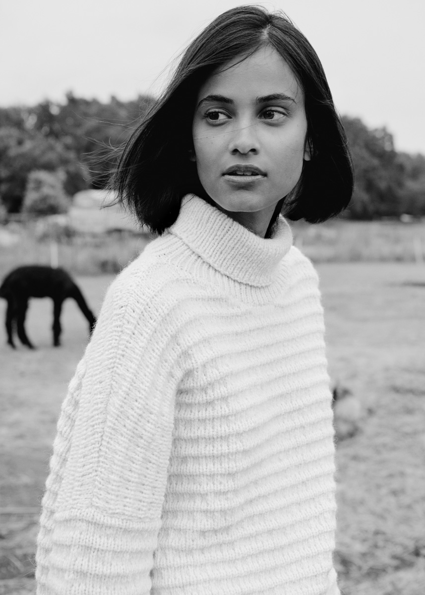 Das Biesen- Hebemaschenmuster von Modell 05 – hier umgesetzt als Oversize- Rollkragenpullover. Die weiten, gemütlichen Ärmel betonen seine lässige Form. Abgeschrägte Schultern sorgen für einen perfekten Sitz.