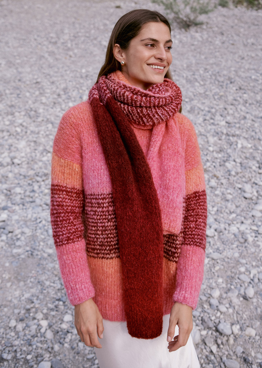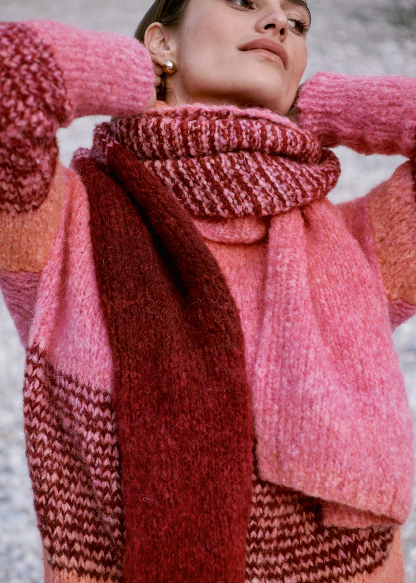 Das Set aus einem neuen, schwerelosen Alpaka-Gemisch wird mit relativ dicken Nadeln gestrickt. Für maximale Effekte kommt das fluffige Verlaufsgarn hier in einer frischen und einer dunklen Farbstellung zum Einsatz.