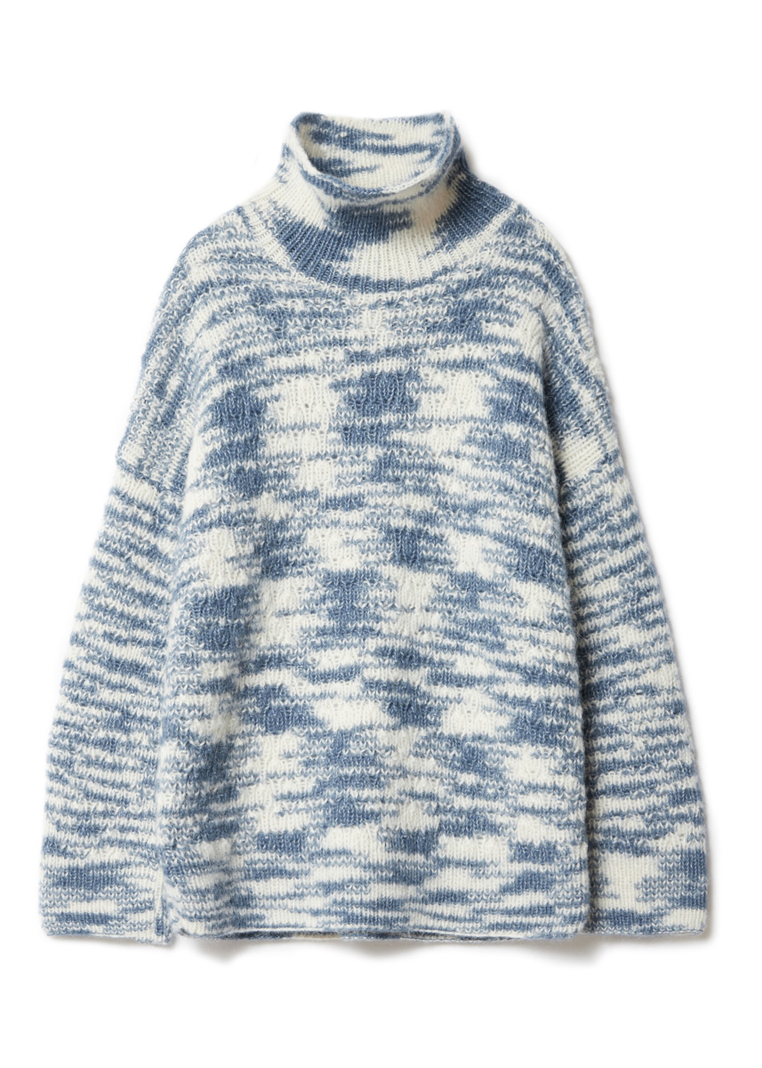 Bei Natural Alpaca Pelo gibt es ganz neue Farben, die Strickbilder kreiren, die an folkloristische Ikatmuster erinnern. Hier wurde das Garn im Grundmuster nach einer Strickschrift zu einem langen und lockeren Rolli verstrickt.
