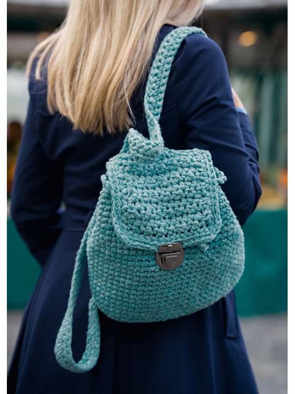 Lana Grossa The Paper (70% Polyester, 30% Viskose, Lauflänge 100 m/100 g), 400 g Türkis (Fb. 9); je 1 Häkelnadel Nr. 7 und 9, 3 Ringe zum Öffnen, Ø 28 mm, 1 Steckschloss für Taschen.