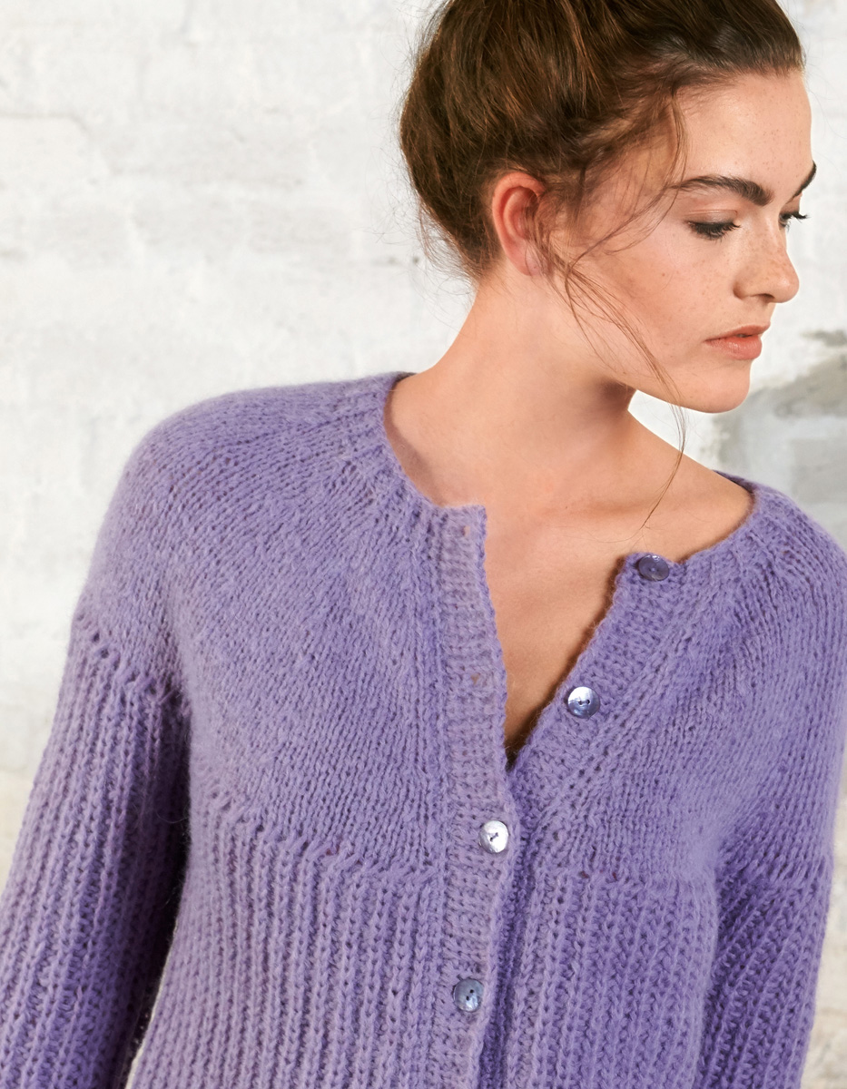 Lana Grossa-Qualität „Brigitte No. 2” (47 % (Baby) Alpaka, 45 % Baumwolle, 8 % Schurwolle (Merino), LL = ca. 140 m/50 g): ca. 350 (400) g Lila (Fb. 26); Stricknadeln Nr. 4 und 6, je 1 Rundstricknadel Nr. 6, 80 und 120 cm lang, 1 Rundstricknadel Nr. 4, 80 cm lang, 1 Wollhäkelnadel Nr. 4; 7 Perlmuttknöpfe von Union Knopf, Art. 46286, ø 18 mm, Fb. 60 lila, farblich passende Nähseide.