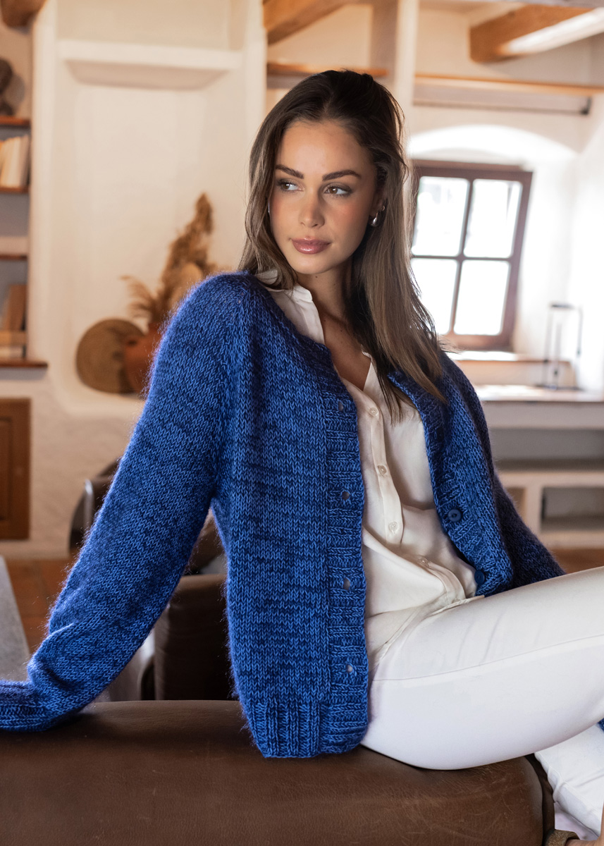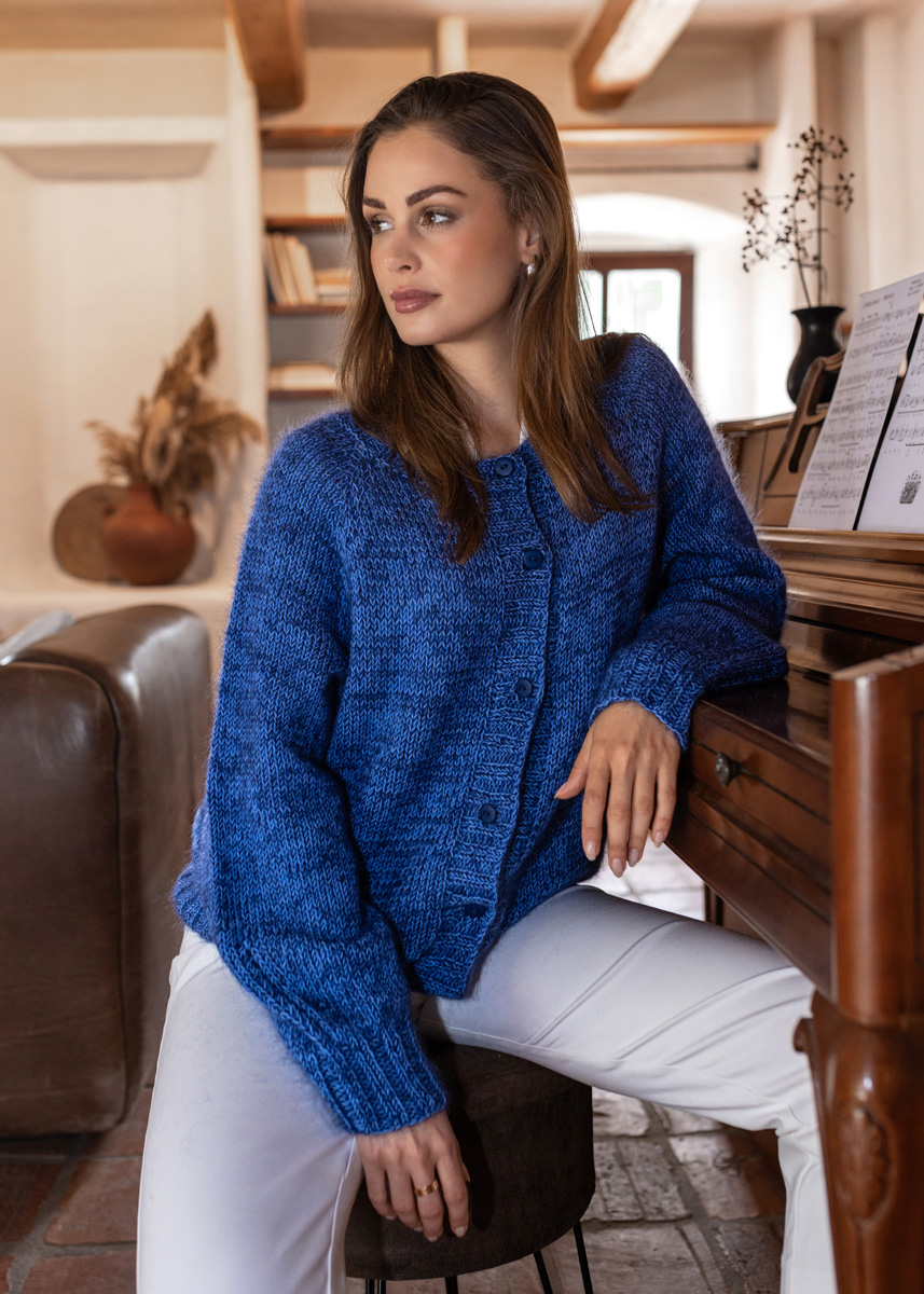 Die Jacke wird nahtlos in einem Stück von oben nach unten gestrickt und hat eine Gesamtlänge von 55 (57 - 59 - 61 - 63 - 66) cm und eine Brustmehrweite von 18 cm bei 80 cm Brustumfang (18 cm bei 88 cm Brustumfang - 18 cm bei 96 cm Brustumfang - 18 cm bei 104 cm Brustumfang - 18 cm bei 116 cm Brustumfang - 14 cm bei 128 cm Brustumfang).