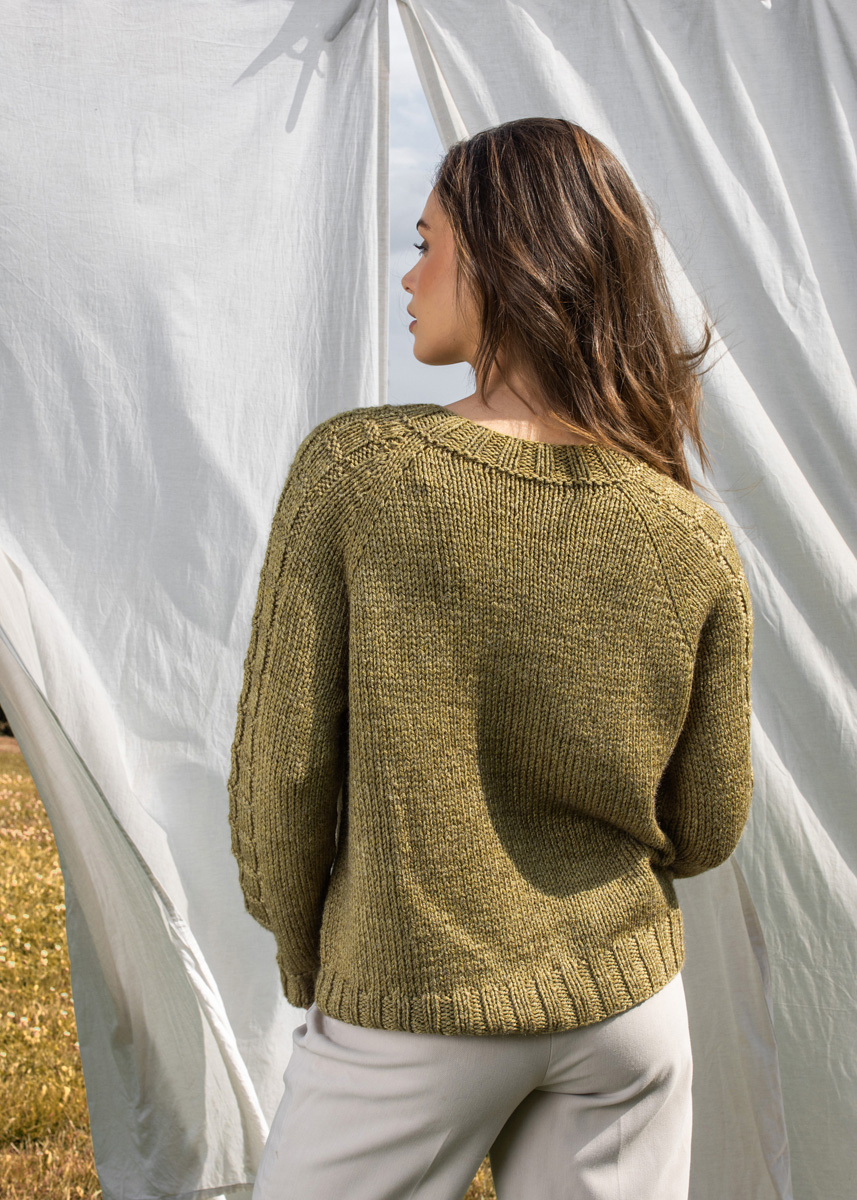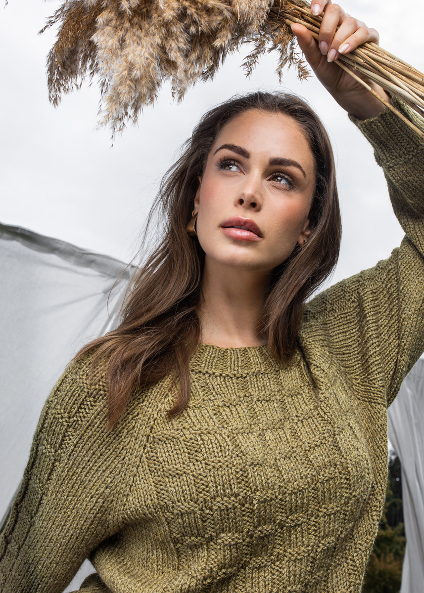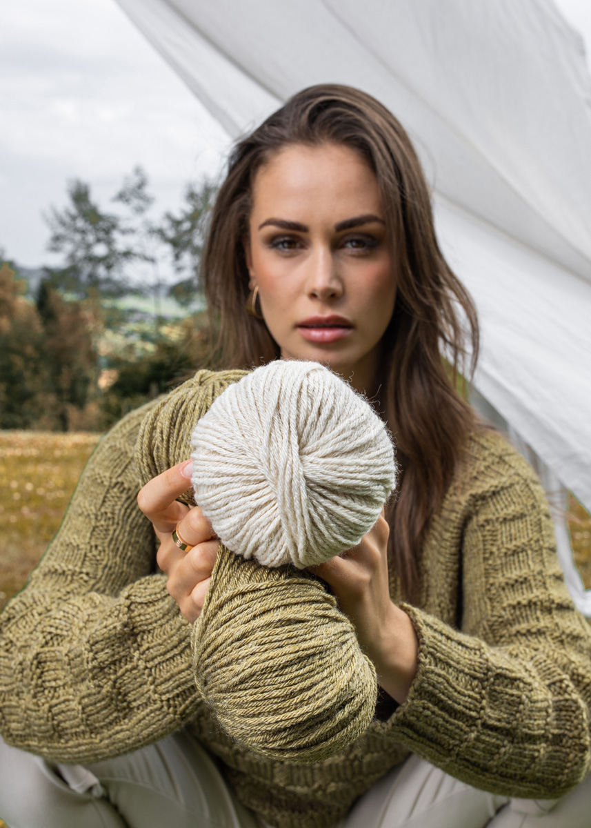 Oliv bringt Farbe in deine Garderobe und strahlt gleichzeitig Ruhe und Eleganz aus. Die erdige, warme Nuance passt perfekt zu den Herbst- und Wintermonaten und lässt sich vielseitig zu Jeans oder hellen Tönen kombinieren. Der Pullover wird top down gearbeitet und erfordert Erfahrung und Routine.