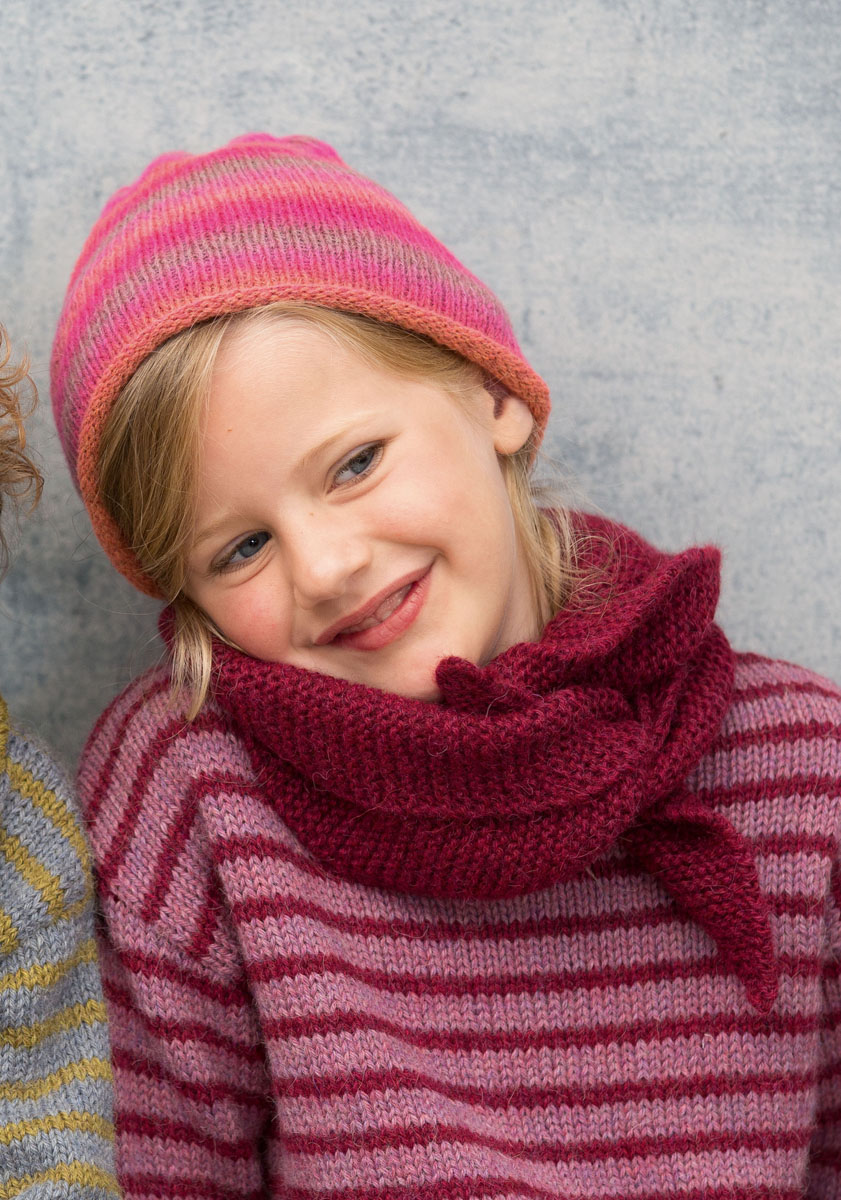 Lana Grossa Alpaca Peru 100 (100% Baby Alpaka, Lauflänge 100 m/50 g), 100 g Oliv (Fb 113) bzw. Purpurrot (Fb 103); Stricknadeln Nr. 4.