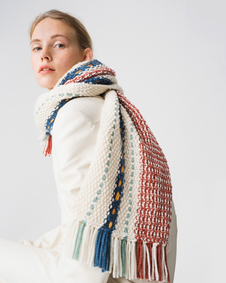Lana Grossa Alta Moda Cashmere 16 (78 % Schurwolle, 12 % Kaschmir, 10 % Polyamid, Lauflänge 110 m / 50 g) 300 g Rohweiß (Fb 16), 100 g Tonrot (Fb 30), 50 g Taubenblau (Fb 33), 50 g Quitte (Fb 28) und 50 g Minttürkis (Fb 34); eine 120 cm lange Rundstricknadel Nr. 7, Häkelnadel Nr. 6.