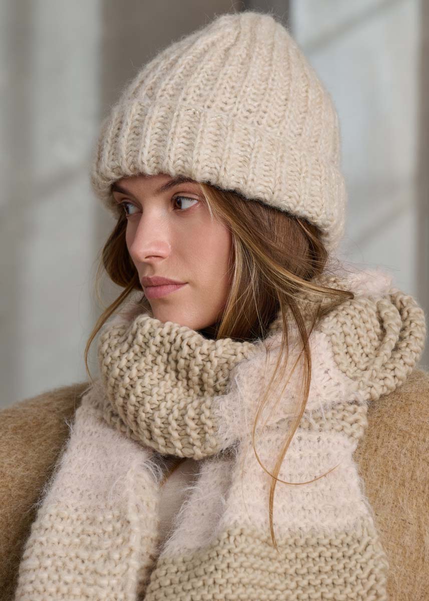 Lana Grossa „Per Lei“ (100% Schurwolle (Merino), LL= ca. 60 m/50 g): ca. 150 g Beige (Fb 19) „Basta“ (50% Schurwolle (Merino), 50% Polyamid, LL= ca. 100 m/50 g): ca. 100 g Beige (Fb. 3) „Alpaca Air“ (62% Alpaka (Baby), 27% Polyamid, 11% Schurwolle (Merino Fein), LL= ca. 140 Meter/50 g): ca. 100 g Beige (Fb. 2), Stricknadeln Nr. 10