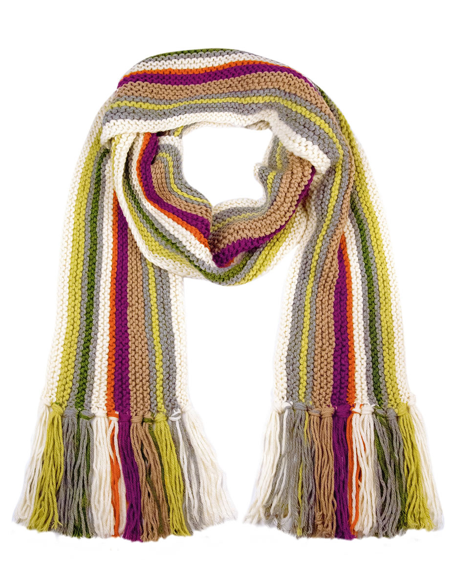 Lana Grossa-Qualität „Brigitte No. 1” (85 % Schurwolle (16 micron), 15 % Kaschmir, LL = ca. 80 m/50 g): je ca. 100 g Natur (Fb. 11) und Grau (Fb. 9) und je ca. 50 g Limone (Fb. 6), Beige (Fb. 8), Violett (Fb. 3), Orange (Fb. 2) und Grün (Fb. 5); 1 Rundstricknadel Nr. 8, 120 cm lang, 1 Wollhäkelnadel Nr. 7 zum Einknüpfen der Fransen.