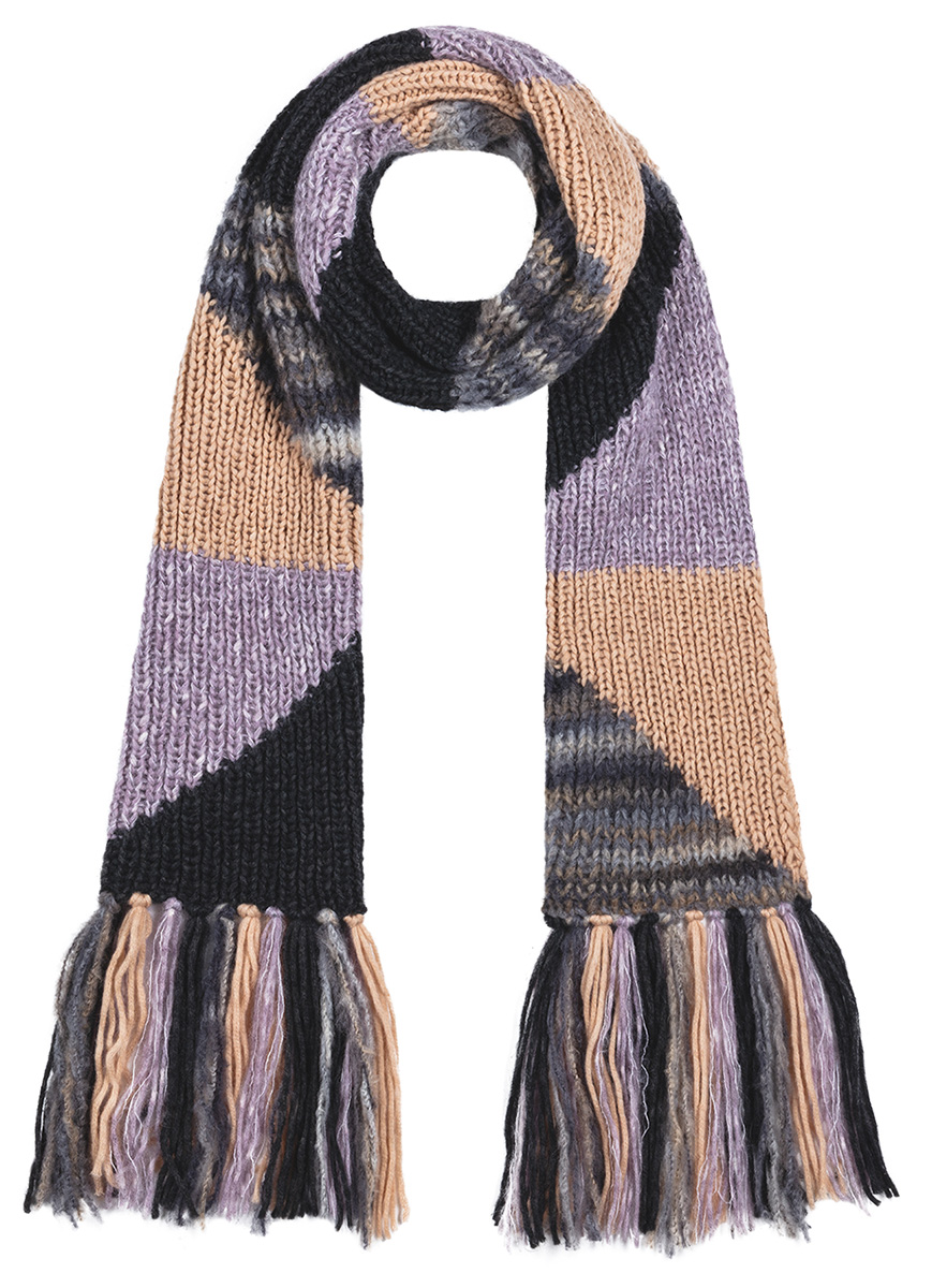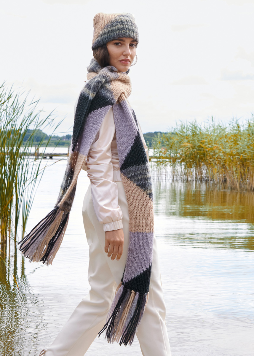 Lana Grossa Brigitte No. 2 Seta (38% (Baby) Alpaka, 33% Polyacryl, 25% Schurwolle (Merino), 4% Seide, Lauflänge 175 m/50 g), 50 g Flieder meliert (Fb 4), Lana Grossa Twin 50 g (46% (Baby) Alpaka, 45% Schurwolle (Merino), 9% Polyamid, Lauflänge 85 m/50 g), 100 g Hell-/Mittel-/Dunkel-/Silbergrau (Fb 205) und Lana Grossa Lala Berlin Lovely Cotton (75% Schurwolle (Merino) extrafein, 25% Baumwolle, Lauflänge 90 m/50 g), 100 g Anthrazit (Fb 8) und 100 g Beige (Fb 27); Stricknadeln Nr. 7 und 1 Häkelnadel Nr. 6 zum Einziehen der Fransen.