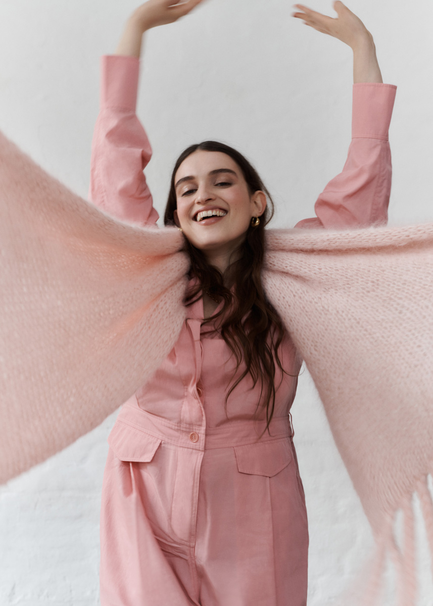 Lana Grossa „Brigitte No. 3“ (40% Mohair, 37% Schurwolle Merino, 23% Polyamid; Lauflänge ca. 100 m/25 g), 450 g in Zartrosa (Fb 8); Lana Grossa „Diamante“ (100% Polyester; Lauflänge ca. 195 m/25 g), 100 g in Rosa (Fb 2); Rundstricknadel Nr. 9 in 60 cm Länge.