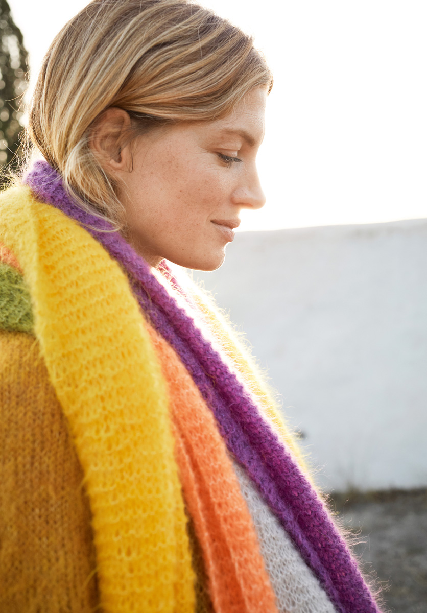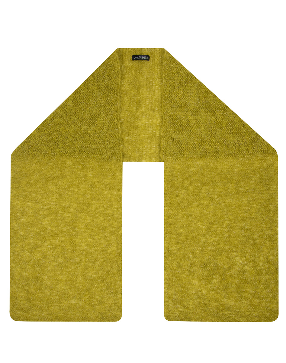 Lana Grossa Brigitte No 3 (40% Mohair, 37% Schurwolle, 23% Polyamid, Lauflänge 100 m/25 g), pro Schal je 100 g, wahlweise in Gelb (Fb 1), Orange (Fb 2), Violett (Fb 5), Oliv (Fb 14) oder Beige (Fb 18); Stricknadel Nr. 5,0.