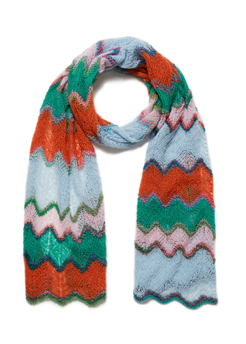 Schal 13a/b: Lana Grossa Colorissimo (100% Schurwolle (Merino extrafein), Lauflänge 300 m/100 g), 100 g Petrolblau/Pink/Apfel-/Hellgrün/Rot/Jade/Schwarzblau (Fb. 203) und Lana Grossa Soffio (60% Schurwolle (Merino superfein), 30% (Bio) Baumwolle, 10% Kaschmir, Lauflänge 212 m/25 g), 50 g Grün (Fb. 9), 50 g Rostorange (Fb. 5), 50 g Rosa (Fb. 1) und 50 g Hellblau (Fb. 13); Stricknadeln Nr. 5,5, Schal 13a: 1 Häkelnadel Nr. 4,5 zum Einziehen der Fransen.