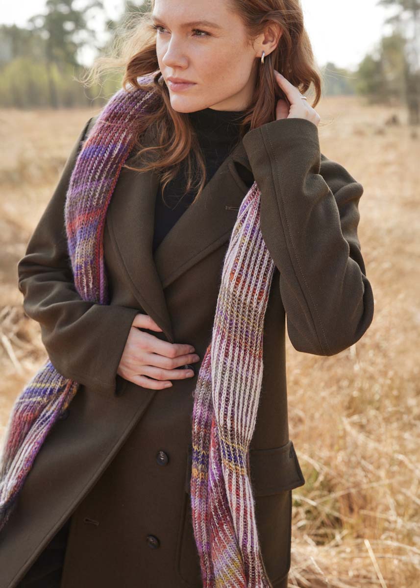 Lana Grossa Colorissimo (100% Schurwolle (Merino fine), Lauflänge 300 m/100 g), 200 g in Braunorange/ Rotbraun/ Kupferrot/Fliederlila/Aubergine/Graugrün/Oliv (Fb. 214), Lana Grossa Ecopuno (72% Baumwolle, 17% Schurwolle (Merino), 11% Alpaka (Baby), Lauflänge 215 m/50 g), 100 g in Perlbeige (Fb. 66) und Lana Grossa Brillino (83% Viskose, 17% Metallische Faser, Lauflänge 200 m/25 g), 25 g in Grège/Silber (Fb. 39); 1 Rundstricknadel Nr. 4,5, 1 Nadelspielnadel Nr. 4,5.