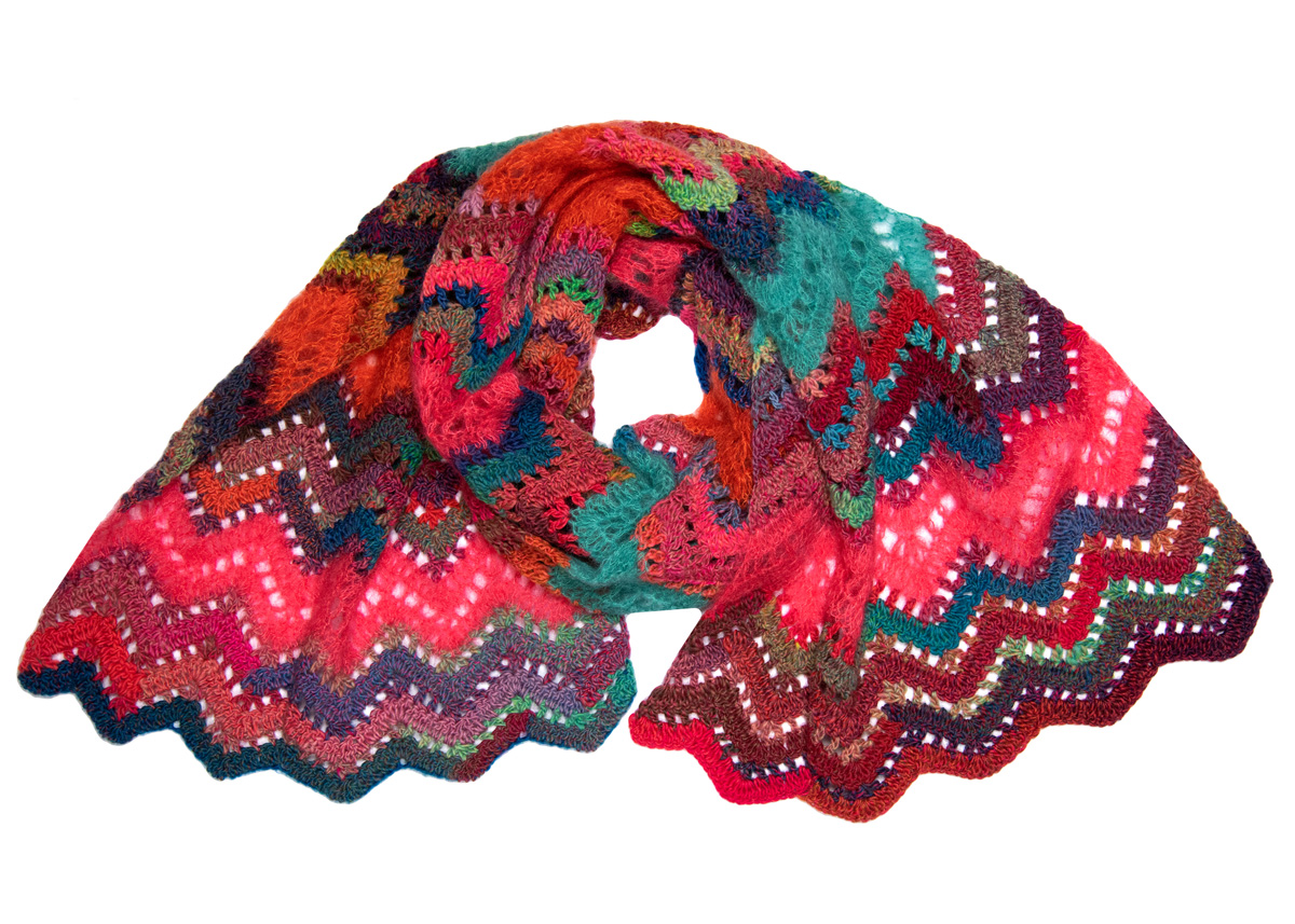 Lana Grossa Colorissimo (100% Schurwolle Merino extrafein, Lauflänge 300 m/100 g), 300 g Rost/ Petrol/Lachsrot/Grün/Rot/Weinrot/ Himbeer (Fb 7) und Lana Grossa Silkhair (70% Mohair, 30% Seide, Lauflänge 210 m/25 g), 25 g Dunkelorange (Fb 136), 25 g Himbeer (Fb 70) und 25 g Türkisgrün (Fb 120); 1 Häkelnadel Nr. 4,5.