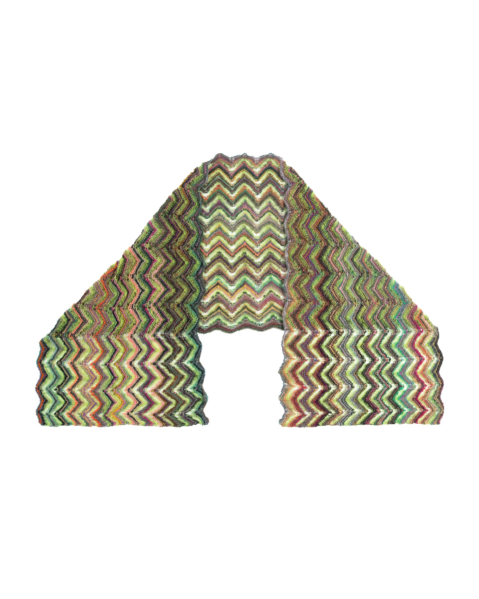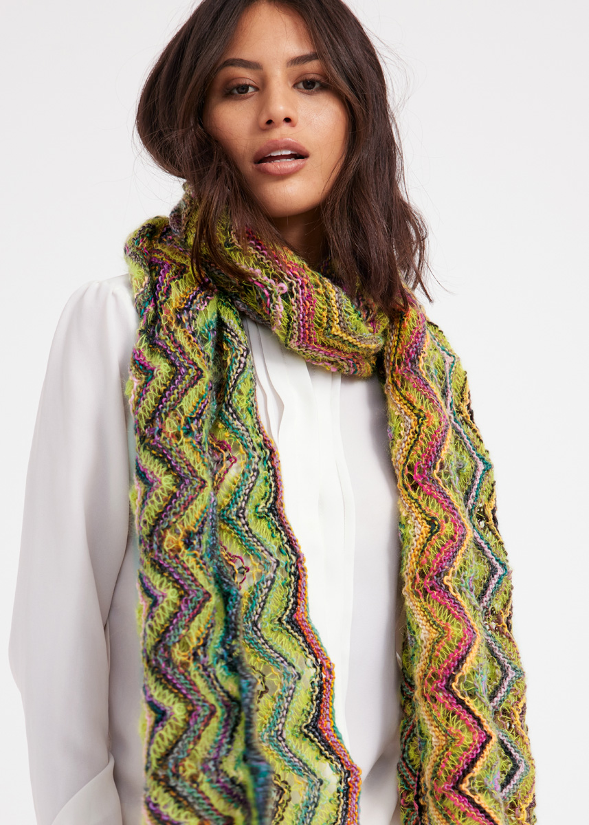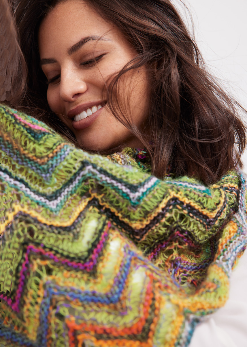 Lana Grossa Colorissimo (100% Schurwolle (Merino extrafein), Lauflänge 300 m/100 g), 300 g Senf/ Petrol/Lachs/Pink/Orchidee/Mint/ Dunkelgrün (Fb 10) und Lana Grossa Silkhair (70% Mohair, 30% Seide, Lauflänge 210 m/25 g) 50 g Signalgrün (Fb 157); 1 Rundstricknadel Nr. 5, 120 cm lang.
