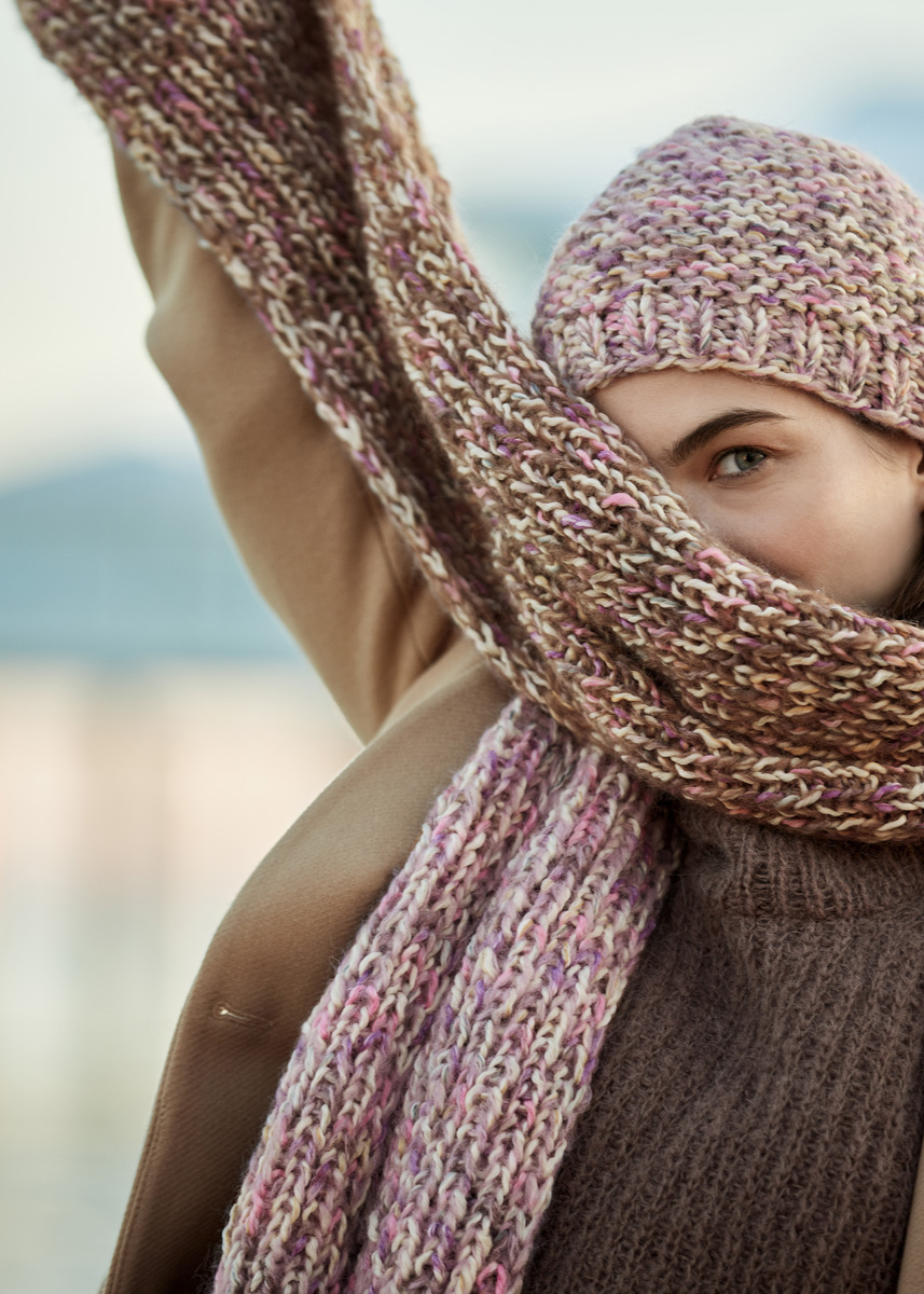 Lana Grossa-Qualität „Colortwist“ (74 % Schurwolle (Merino), 20 % Baumwolle, 6 % Polyamid, LL = ca 90 m/50 g): ca 200 g Weiß/ Rosa/Grau/Mauve (Fb 1) und „Setasuri Big“ (70 % Alpaka (Suri), 20 % Seide, 10 % Schurwolle (Merino), LL = ca 100 m/25 g): je ca 50 g Flieder (Fb 503) und Nougat (Fb 518); Stricknadeln Nr 7. Der Schal wird mit doppeltem Faden gestrickt: je 1 Faden Colortwist und 1 Faden Setasuri Big.