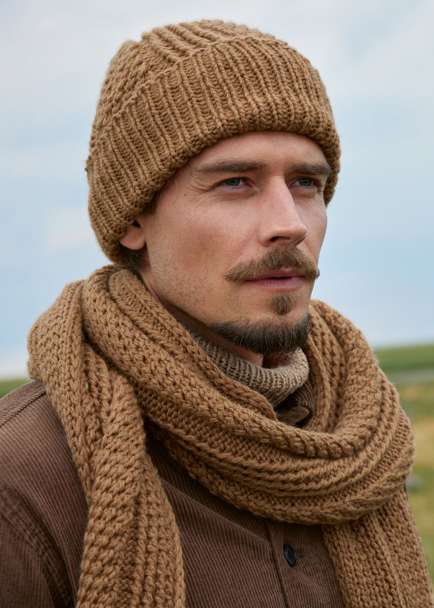 Lana Grossa Cool Merino Big (90% Schurwolle (Merino), 10% Polyamid, Lauflänge 90 m/50 g), 550 g Camel (Fb 216); Stricknadeln Nr. 5 und 7.