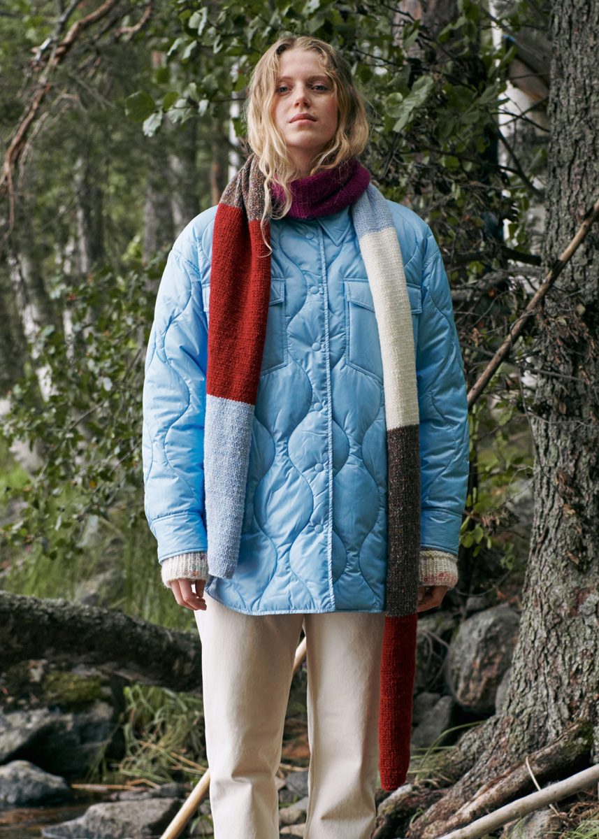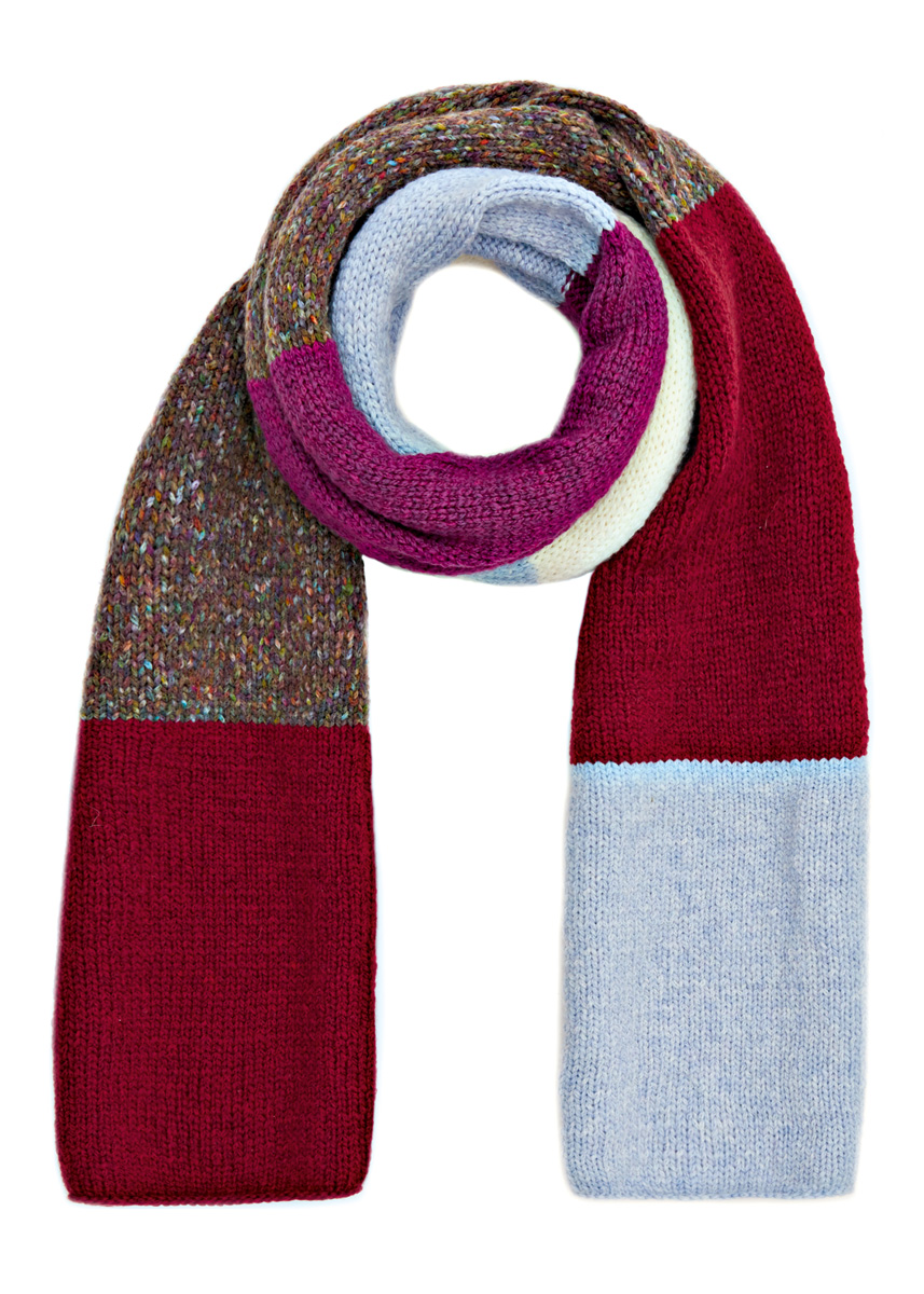 Lana Grossa-Qualität „Cool Merino Print“ (90 % Schurwolle (Merino), 10 % Polyamid, Lauflänge 150 m/50 g): ca. 100 g Grün/Braun/Brombeer/Fuchsia/ Aubergine (Fb. 102) und Lana Grossa-Qualität „Cool Merino“ (90 % Schurwolle (Merino), 10 % Polyamid, Lauflänge 150 m/50 g): je ca. 100 g Dunkelrot (Fb. 1) und Hellblau (Fb. 6) und je ca. 50 g Weiß (Fb. 15) und Fuchsia (Fb. 2); Stricknadeln Nr. 7.