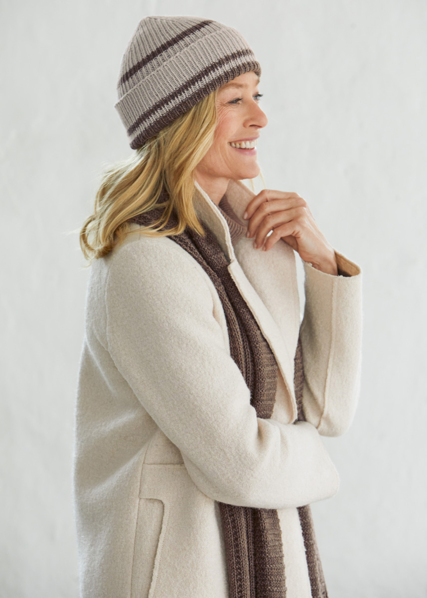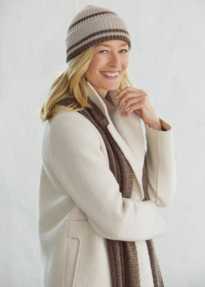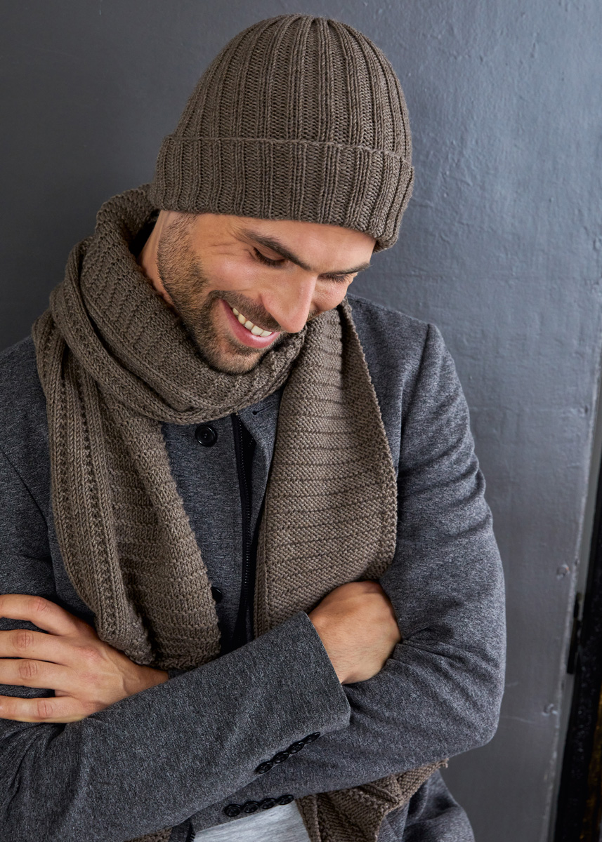 Lana Grossa-Qualität „Cool Wool Big Mélange“ (100% Schurwolle, LL = ca. 120 m/50 g); ca. 300 g Graubraun meliert (Fb 224); Stricknadel Nr. 4,5–5