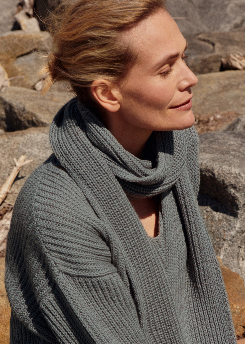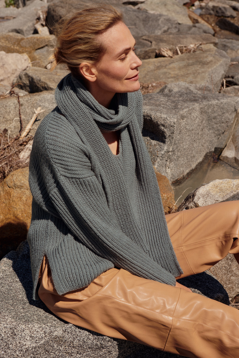 So stylisch geht lässig: Zum simpel gestrickten Halbpatent-Pulli (mit V-Neck und Seitenschlitzen) ein Long-Schal (ca. 17 x 240 cm) aus demselben Garn.