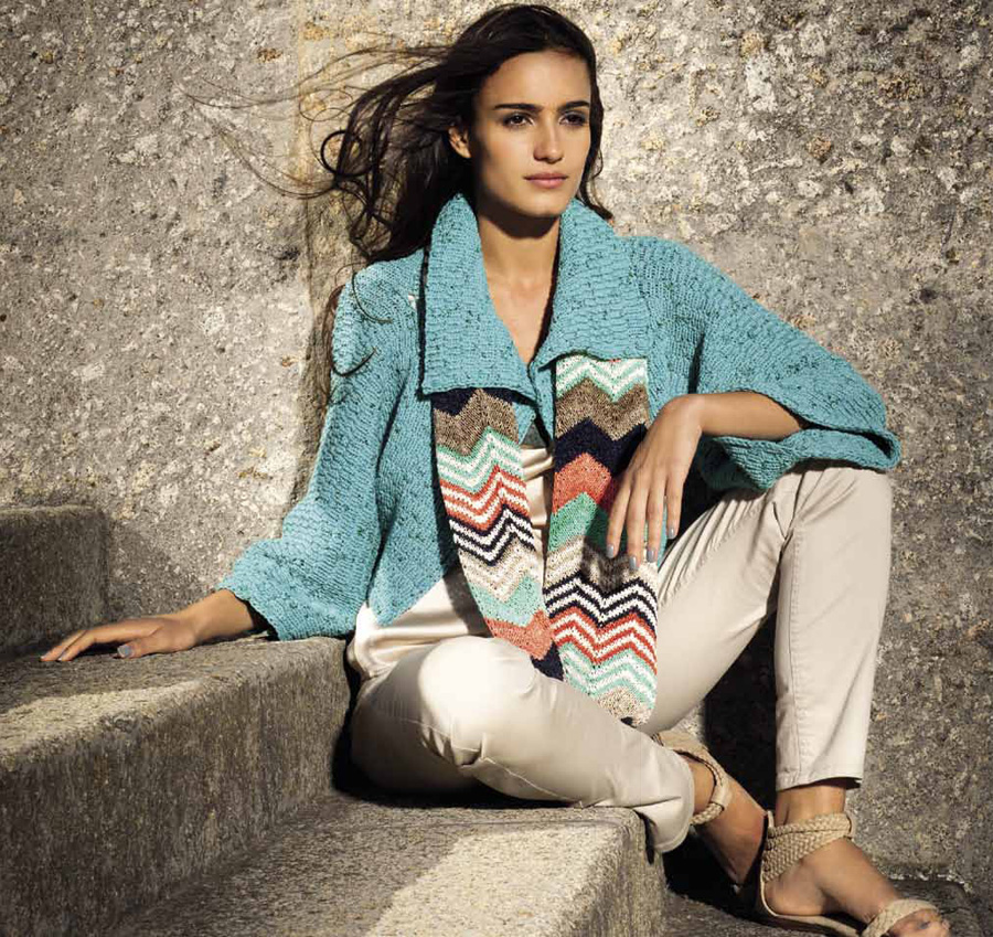 Lana Grossa-Qualität „Divino” (75 % Baumwolle, 25 % Viskose, LL = ca. 110 m/50 g): je ca. 100 g Nachtblau (Fb. 23) und Ecru (Fb. 7) und Lana Grossa-Qualität „Divino Print” (75 % Baumwolle, 25 % Viskose, LL = ca. 110 m/50 g): je ca. 100 g Pastellgrün/Mint (Fb. 112), Lachs/Koralle (Fb. 110) und Beige/Taupe (Fb. 102); Stricknadeln Nr. 4.