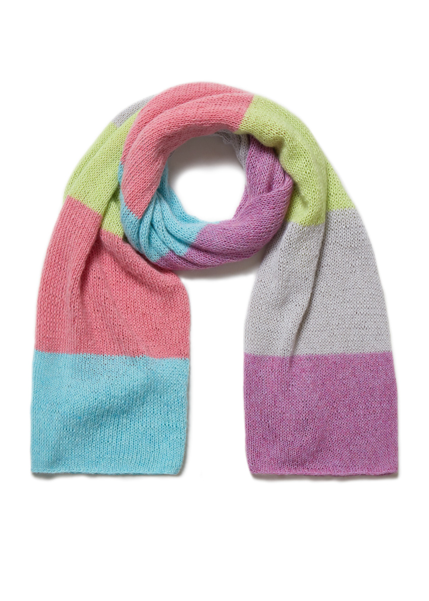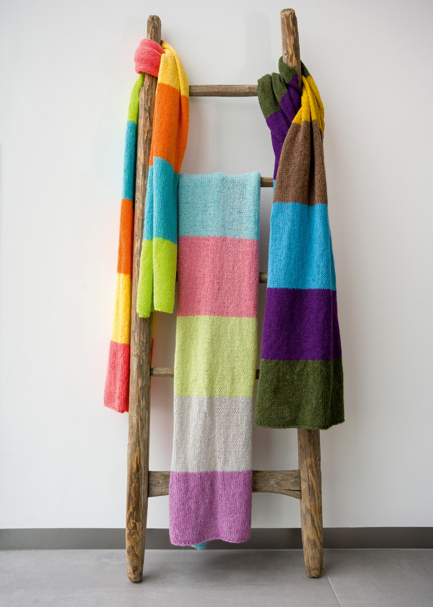 Schal 22b: 50 g Helltürkis (Fb. 77), 50 g Silbergrau (Fb. 45), 50 g Zartgrün (Fb. 78), 50 g Fliederlila (Fb. 83) und 50 g Lachsrosa (Fb. 91);