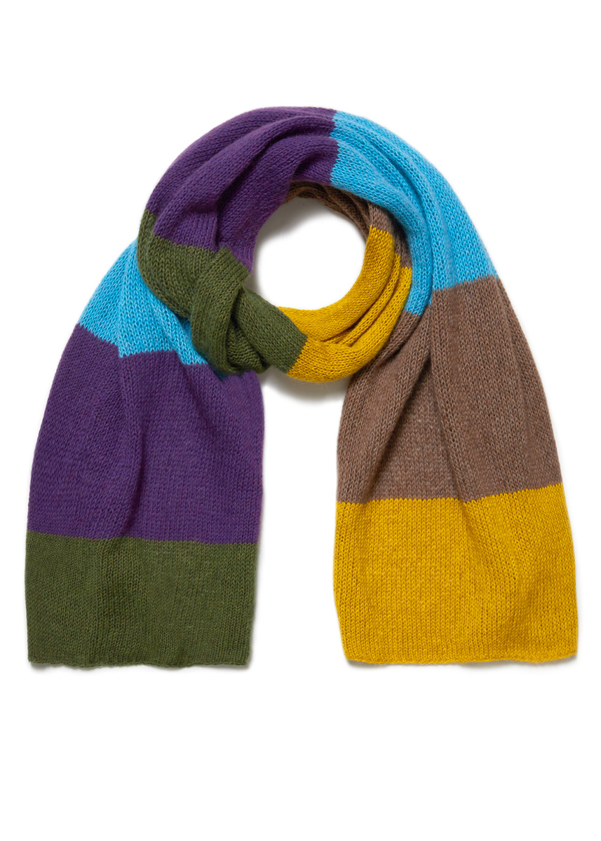 Schal 22c: 50 g Dunkelbraun (Fb. 17), 50 g Azur (Fb. 85), 50 g Violett (Fb. 206), 50 g Loden (Fb. 1) und 50 g Curry (Fb. 94);