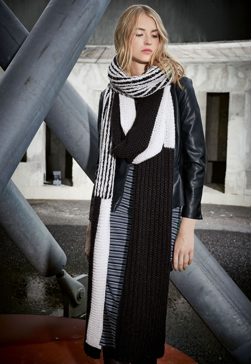 Lana Grossa-Qualität „Lala Berlin Softness” (40 % Schurwolle (Merino extrafine), 40 % Polyamid, 20 % (Superkid) Mohair, LL = ca. 110 m/50 g): ca. 300 g Schwarz (Fb. 7) und ca. 200 g Rohweiß (Fb. 8); Stricknadeln Nr. 8, 1 Rundstricknadel Nr. 10, 60 cm lang.