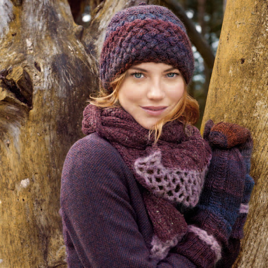 extrafeine Merinowolle (100 % Schurwolle, LL ca. 100 m/50 g): ca. 200 g Brombeer meliert (Fb. 66) und Lana Grossa-Qualität „Woolhair“ (55 % Schurwolle, 30 % Mohair, 15 % Polyamid, LL ca. 200 m/50 g): ca. 50 g Flieder/Taupe meliert (Fb. 9); Stricknadeln Nr. 6, 1 Wollhäkelnadel Nr. 5.