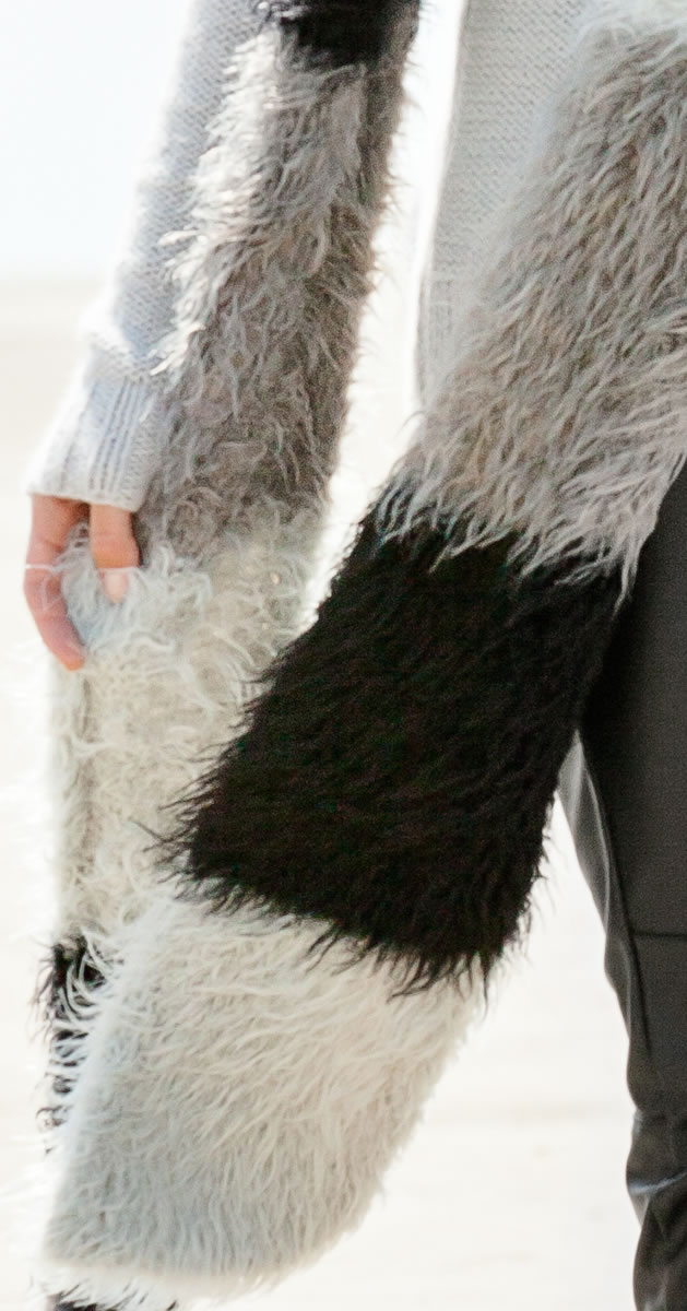 Lana Grossa „Peppina” (60% Polyamid, 25% Schurwolle Merino, 15% Polyacryl, LL = 85 m/50 g) je 200 g Schwarz (Fb 13), Hellgrau (Fb 1), Taupe (Fb 2). Stricknadeln Nr. 7 – 7,5.