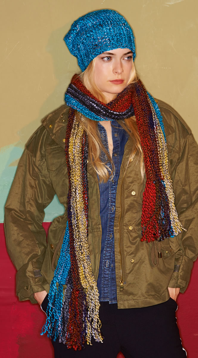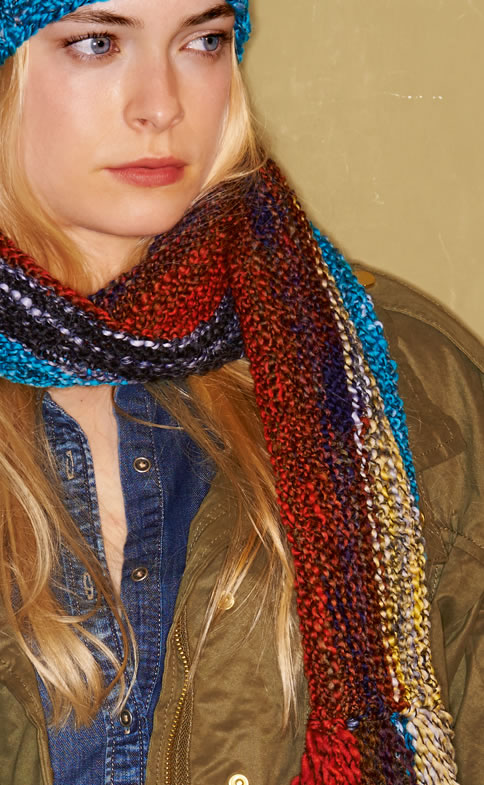 Lana Grossa-Qualität „Twist“ (78 % Schurwolle, 22 % Polyamid, Lauflänge ca. 100 m/50 g): je ca. 50 g Türkis/Grau/Anthrazit (Fb. 1), Rot/Burgund/Orange (Fb. 6), Burgund/Marine/Loden/Rotbraun (Fb. 7), Silbergrau/Anthrazit/Schwarz (Fb. 9) und Gelb/Hellgrau/Anthrazit (Fb. 10); 1 Rundstricknadel Nr. 6, 120 cm lang, 1 Wollhäkelnadel Nr. 5 zum Einziehen der Fransen