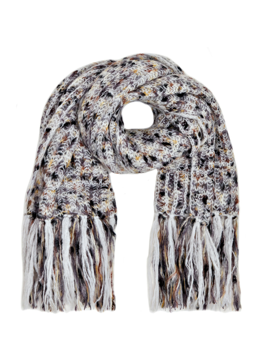 Lana Grossa-Qualität „Lala Berlin Brushy“ (42 % Mohair (Superkid), 38 % Schurwolle (Merino), 20 % Polyamid, Lauflänge 135 m/50 g): je ca. 200 g Silbergrau (Fb. 11) und Rohweiß/Sandgelb/Anthrazit/ Graubraun (Fb. 104); 1 Rundstricknadel Nr. 6, 80 cm lang, 1 Wollhäkelnadel Nr. 10 zum Einziehen der Fransen.