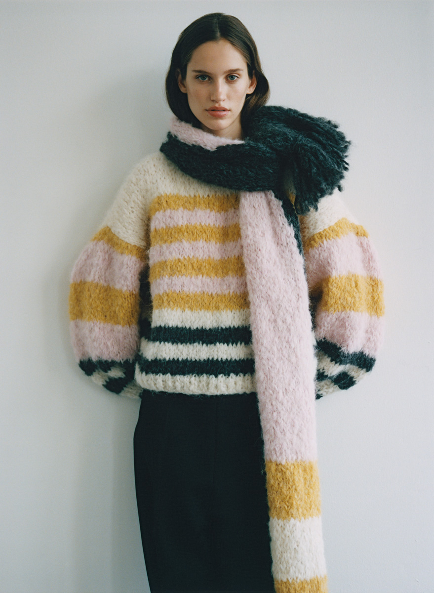 Lana Grossa-Qualität „Lala Berlin Furry“ (90 % (Baby) Alpaka, 10 % Polyamid, Lauflänge 75 m/50 g): je ca. 100 g Anthrazit (Fb. 10) und Pastellrosa (Fb. 12) und je ca. 50 g Gelb (Fb. 3) und Rohweiß (Fb. 1); Stricknadeln Nr. 10, 1 Wollhäkelnadel Nr. 8 zum Einziehen der Fransen.