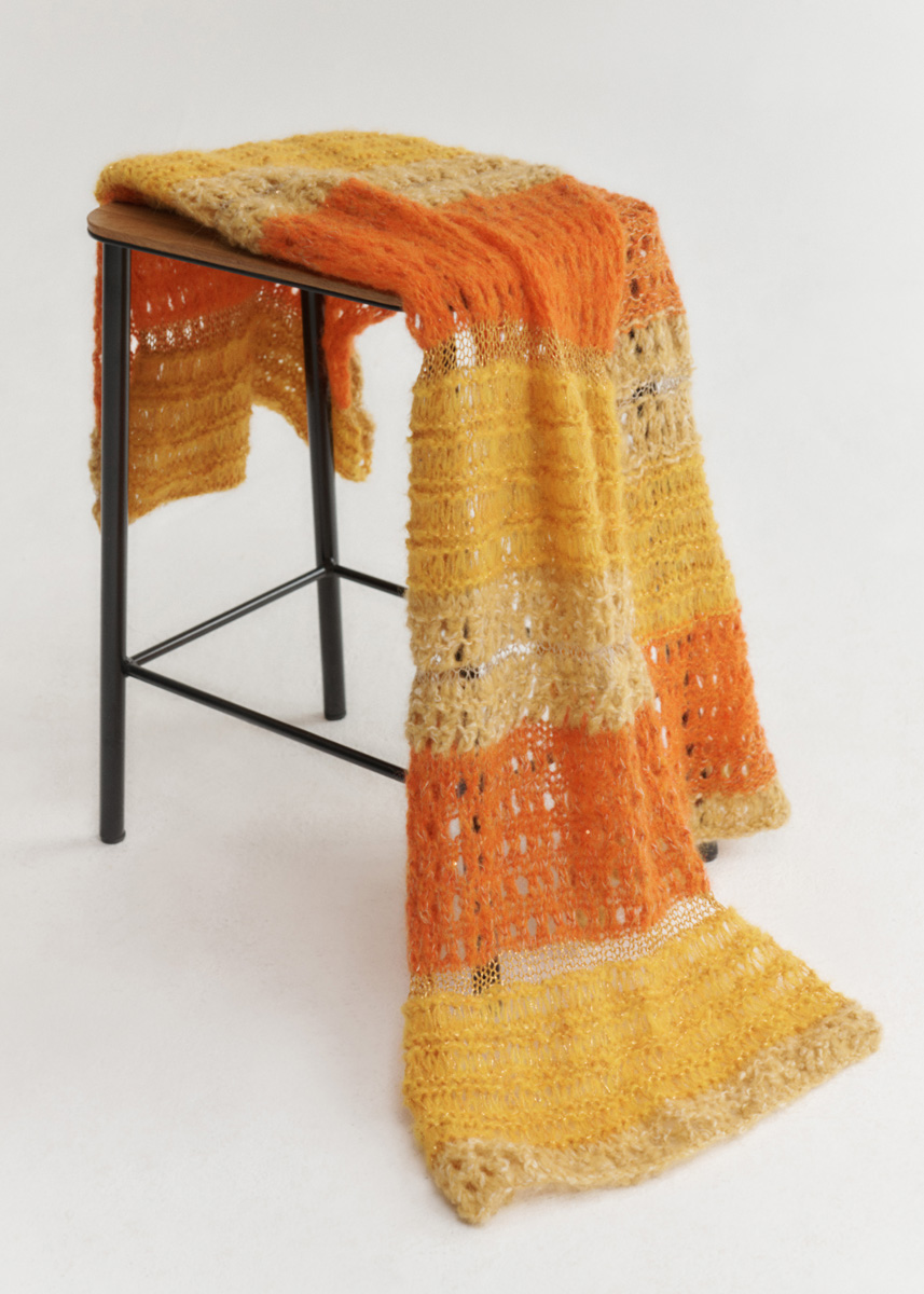 für Schal 2: je ca. 50 g Lala Berlin Harmony in Gelb (Fb. 9) und Nuvoletta in Gelb (Fb. 12) und Orange (Fb. 13) und je ca. 25 g Brillino in Gelbgold (Fb. 3) und Diamante in Beige (Fb. 1),