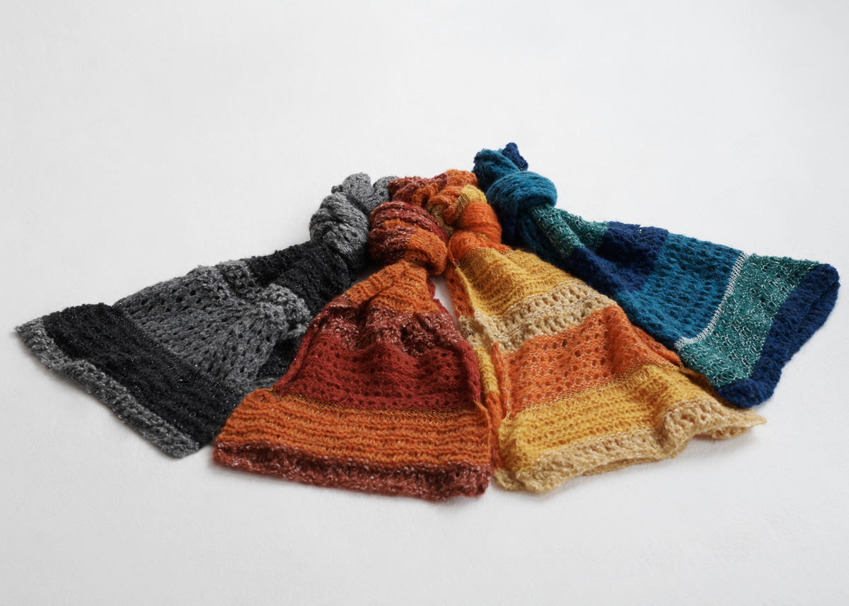 für Schal 5: je ca. 50 g Lala Berlin Harmony in Rotbraun (Fb. 10) und Nuvoletta in Orange (Fb. 13) und Rot (Fb. 5) und je ca. 25 g Brillino in Rotgold (Fb. 2) und Diamante in Himbeerrot (Fb. 5),