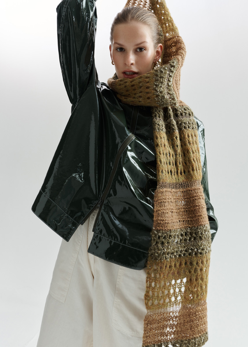 für Schal 6: je ca. 50 g Lala Berlin Harmony in Oliv (Fb. 8) und Nuvoletta in Camel (Fb. 3) und Senf (Fb. 11) und je ca. 25 g Brillino in Camel/gold (Fb. 4) und Diamante in Beige (Fb. 1);