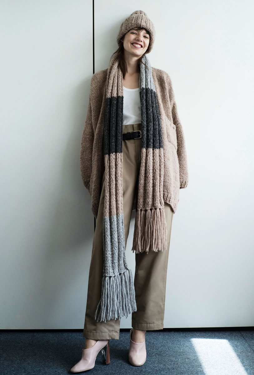 Für Farbstellung C: Lana Grossa Lala Berlin Lovely (52 % Alpaka, 18 % Kaschmir, 18 % Schurwolle, 12 % Polyamid, Lauflänge 90 m/50 g) 150 g Camel (Fb 14), 100 g Anthrazit (Fb 7) und 100 g Hellgrau meliert (Fb 6);