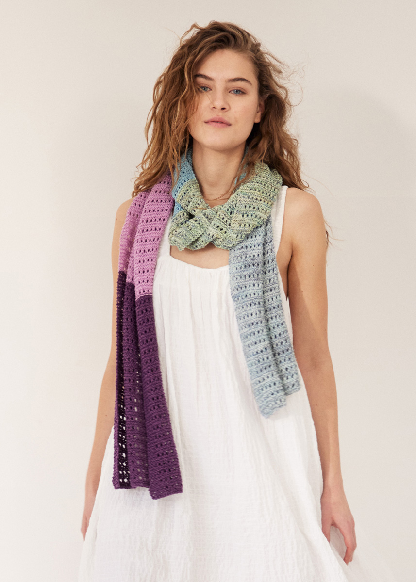 Für diesen Schal brauchen Sie Lana Grossa Landlust Sommerseide (50% Seide, 50% Baumwolle, LL ca. 170 m/50 g), Türkis/violett farbener Schal: je 50 g Graublau Meliert (Fb 106), Türkis (Fb 23), Grüntürkis Meliert (Fb 105), Flieder (Fb 22), Dunkelviolett (Fb 21). Stricknadeln Nr. 4,5.