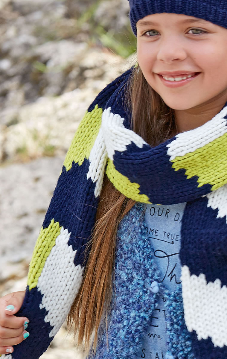 Lana Grossa Mille II (50% Schurwolle Merino extrafine, 50% Acryl, Lauflänge 55 m/50 g), 300 g Nachtblau (Fb 12), 100 g Pistazie (Fb 61) und 100 g Natur (Fb 64); Stricknadeln Nr. 7, 1 Häkelnadel Nr. 5 zum Einziehen der Fransen