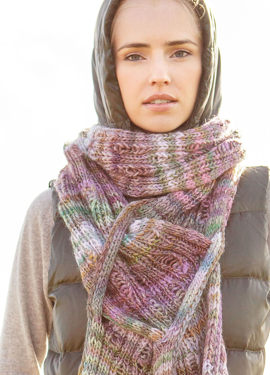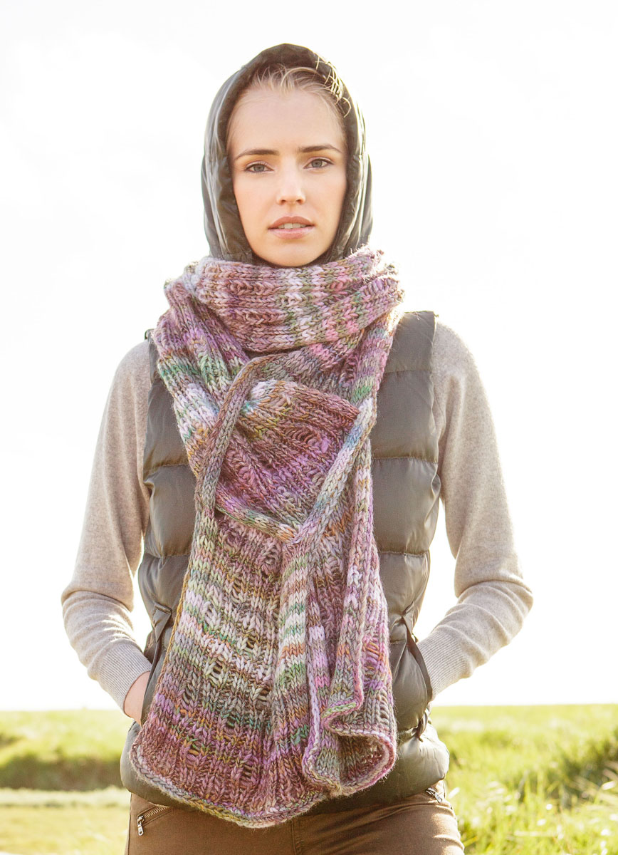 Lana Grossa-Qualität „Gomitolo 100“ (50 % Schurwolle, 50 % Polyacryl, LL = ca. 180 m/100 g), 300 g Zartlila/Brombeer/Gold/Hellgrün (Fb 104). Strick-Nd Nr. 6, 1 Häkel-Nd Nr. 5,5. 2 transparente Druckknöpfe, ca. 16 mm Ø.