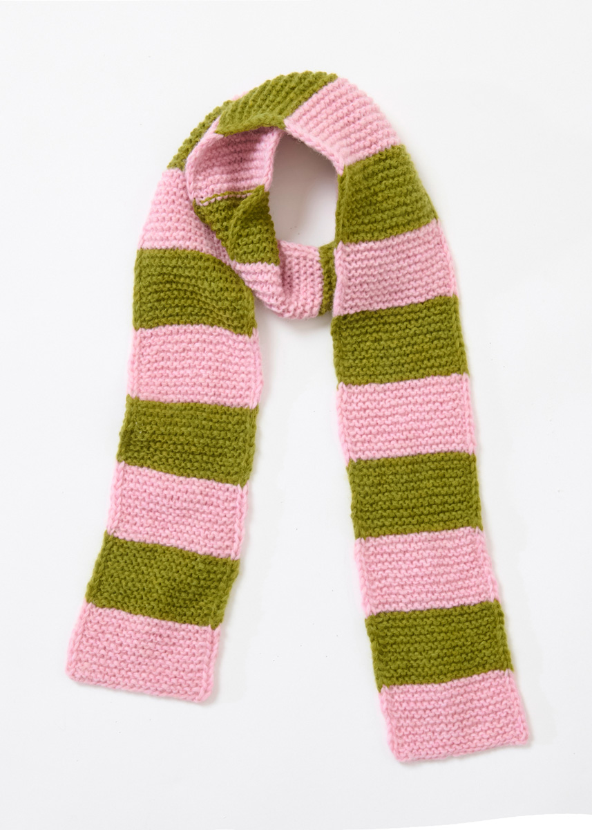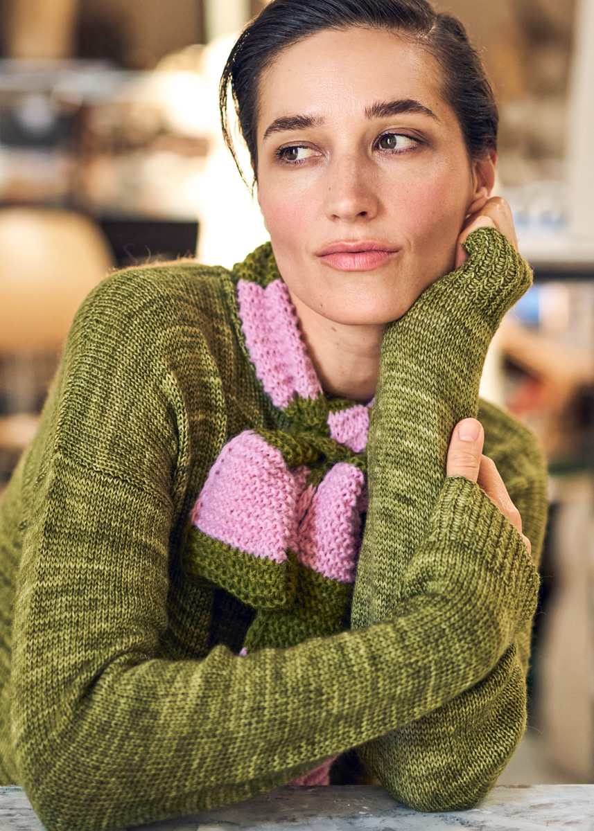 Garn von Lana Grossa, Qualität „Brigitte No. 2“ (47 % Alpaka (Baby), 45 % Baumwolle, 8 % Schurwolle (Merino), Lauflänge 140 m/ 50 g): je 50 g in Zartlila Nr. 78 und Leuchtendrot Nr. 74 oder je 50 g in Rosa Nr. 54 und Avocadogrün Nr. 72. Stricknadeln 5 (wenn Sie locker stricken) oder 6 (wenn Sie fest stricken) – wichtig ist, dass Sie auf die Angaben in der Maschenprobe kommen.