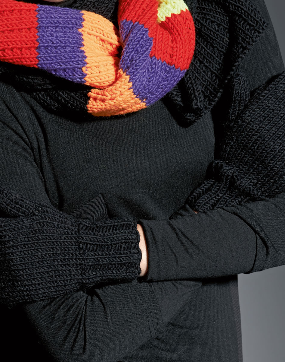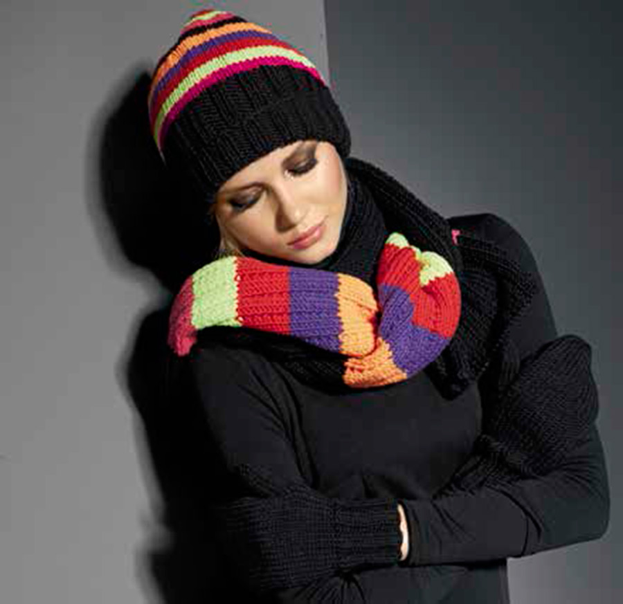 Lana Grossa "Mc Wool Neon Sport" (60% Wolle, 40% Polyacryl, LL = 65 m/50 g) 300 g Schwarz (Fb 10) je 50 g Pink (Fb 104), Neongelb (Fb 102), Rot (106),Violett (Fb 107), Orange (103). Stricknadeln Nr. 5,5.