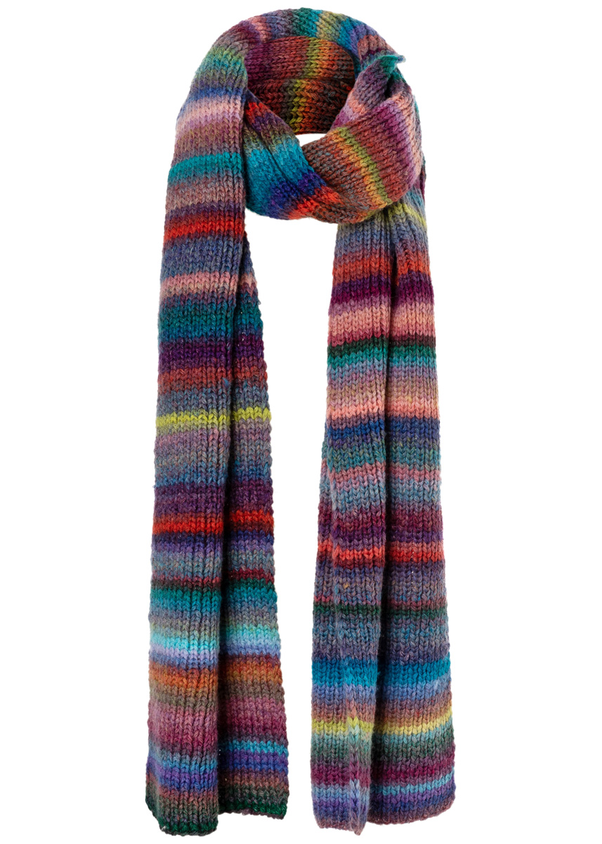 Lieblingsfarben streifenweise liefert Garnneuheit Papagallo. Obendrein hat die leichte Qualität einen hohen Merino-Anteil (90 %), was sie weich und sehr hochwertig macht. Hier wurde sie in Rippen verstrickt – zu einem Traumschal, der sich toll kombinieren lässt.