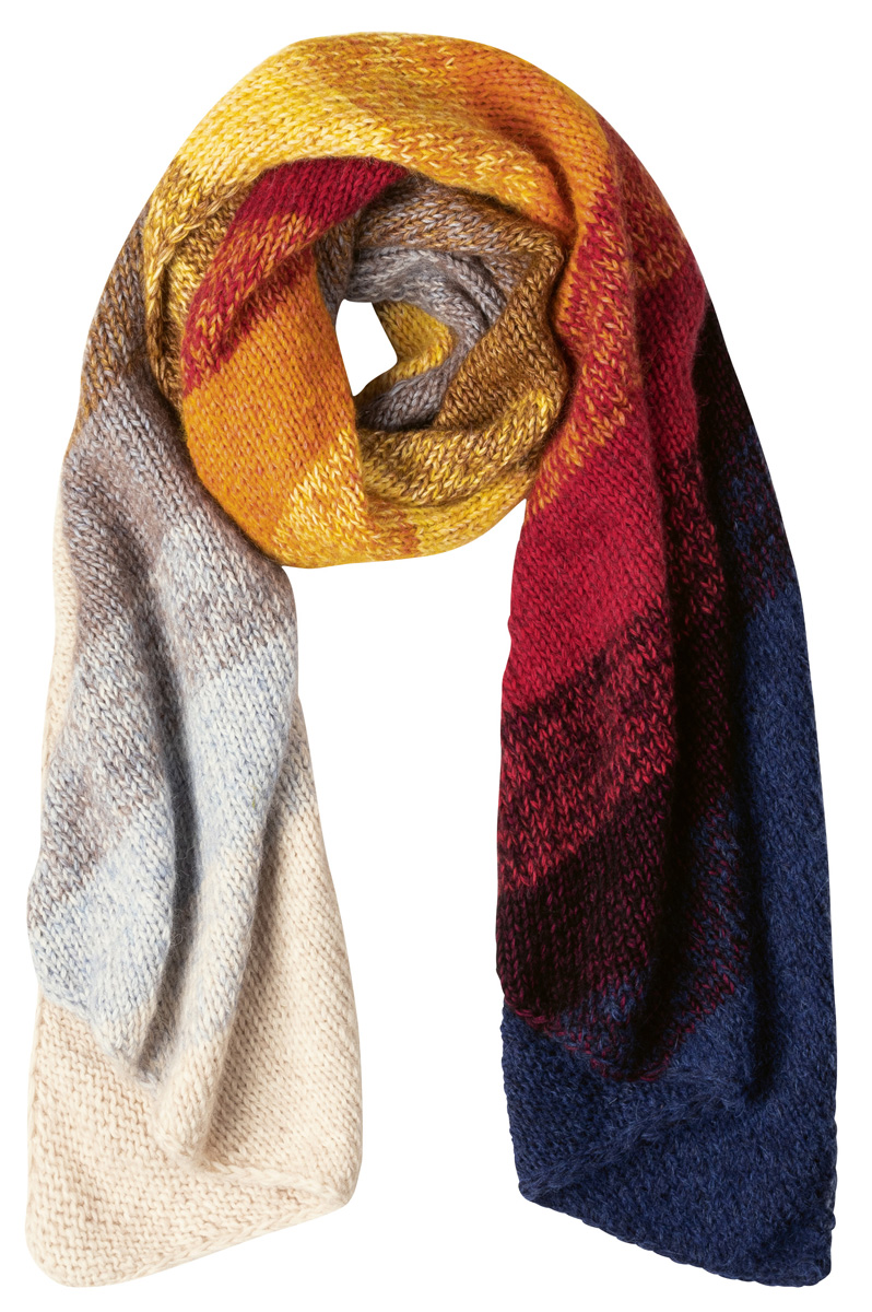 Lana Grossa Qualität „Puno Due“ (63% Baumwolle, 37% (Baby) Alpaca), LL= 210 m/50 g): 50 g Hellbeige/Creme (Fb. 15), 50 g Weiß/Veilchenblau (Fb. 22), 50 g Grau/Camel (Fb. 25), 50 g Zartgelb/Camel (Fb. 7), 50 g Gelb/Orange (Fb. 19), 50 g Orange/Gelb (Fb. 17), 50 g Rot/Dunkelrot (Fb. 4), 50 g Dunkelfuchsia/ Schwarz (Fb. 3), 50 g Schwarz/Nachtblau (Fb. 30), Stricknadeln Nr. 7.