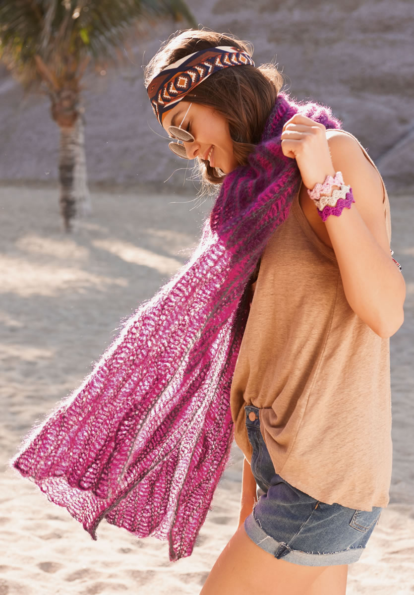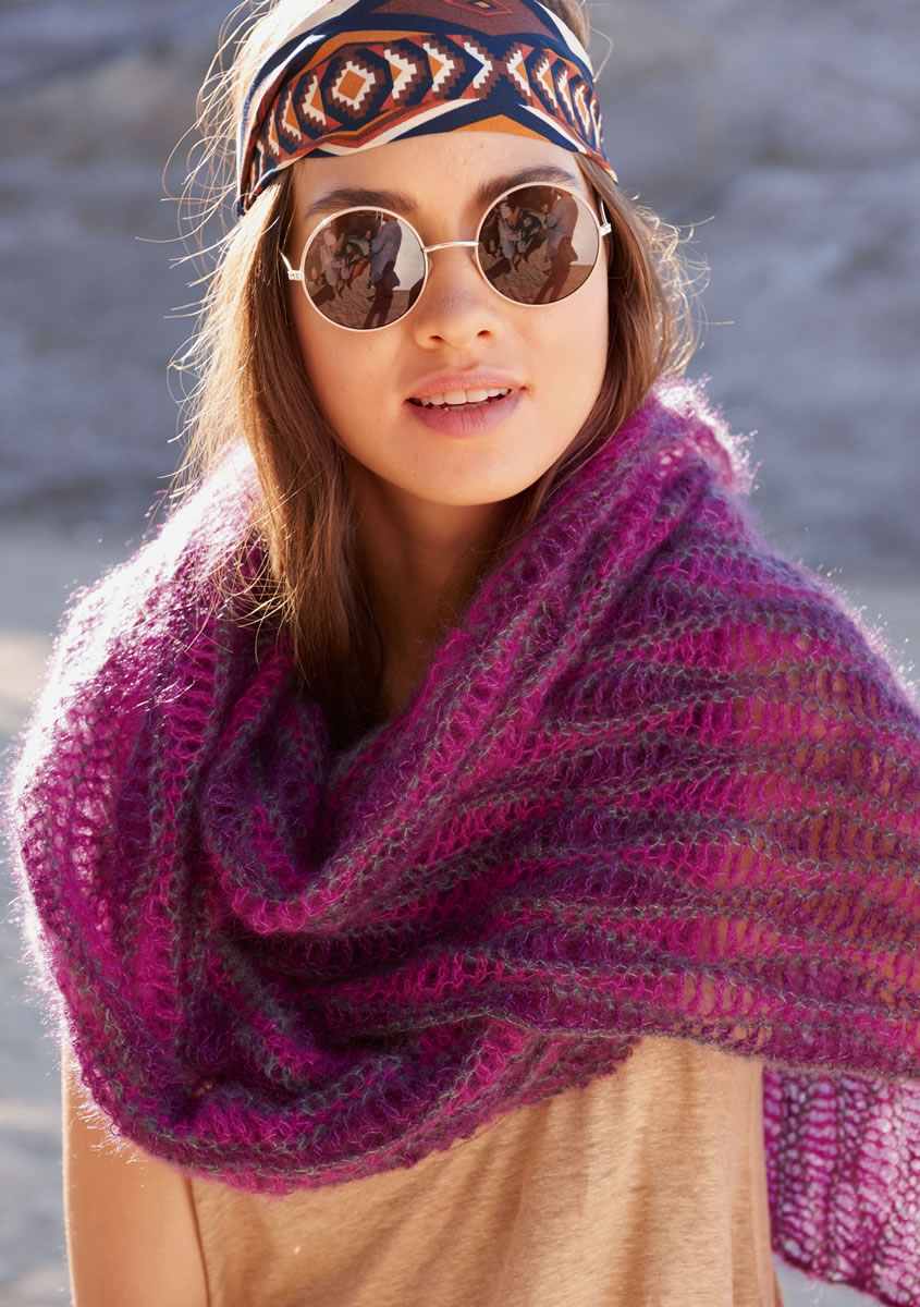 Lana Grossa Silkhair (70% Mohair,30% Seide, Lauflänge 210m / 25 g), je 50 g in Schiefer (Fb 84), Magnolie (Fb 75) und Rotviolett (Fb 100), Häkelnadel Nr. 5,0.
