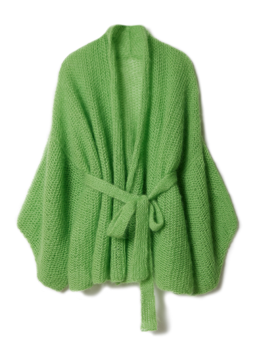 Lana Grossa-Qualität „Silkhair“ (70 % Mohair (Superkid), 30 % Seide, LL = ca 210 m/25 g): ca 250 (275 - 300 - 325) g Frühlingsgrün (Fb 191); Stricknadeln Nr 6; 1 kurze Rundstricknadel Nr 6; 1 Maschenmarkierer; 1 Häkelnadel Nr 6.