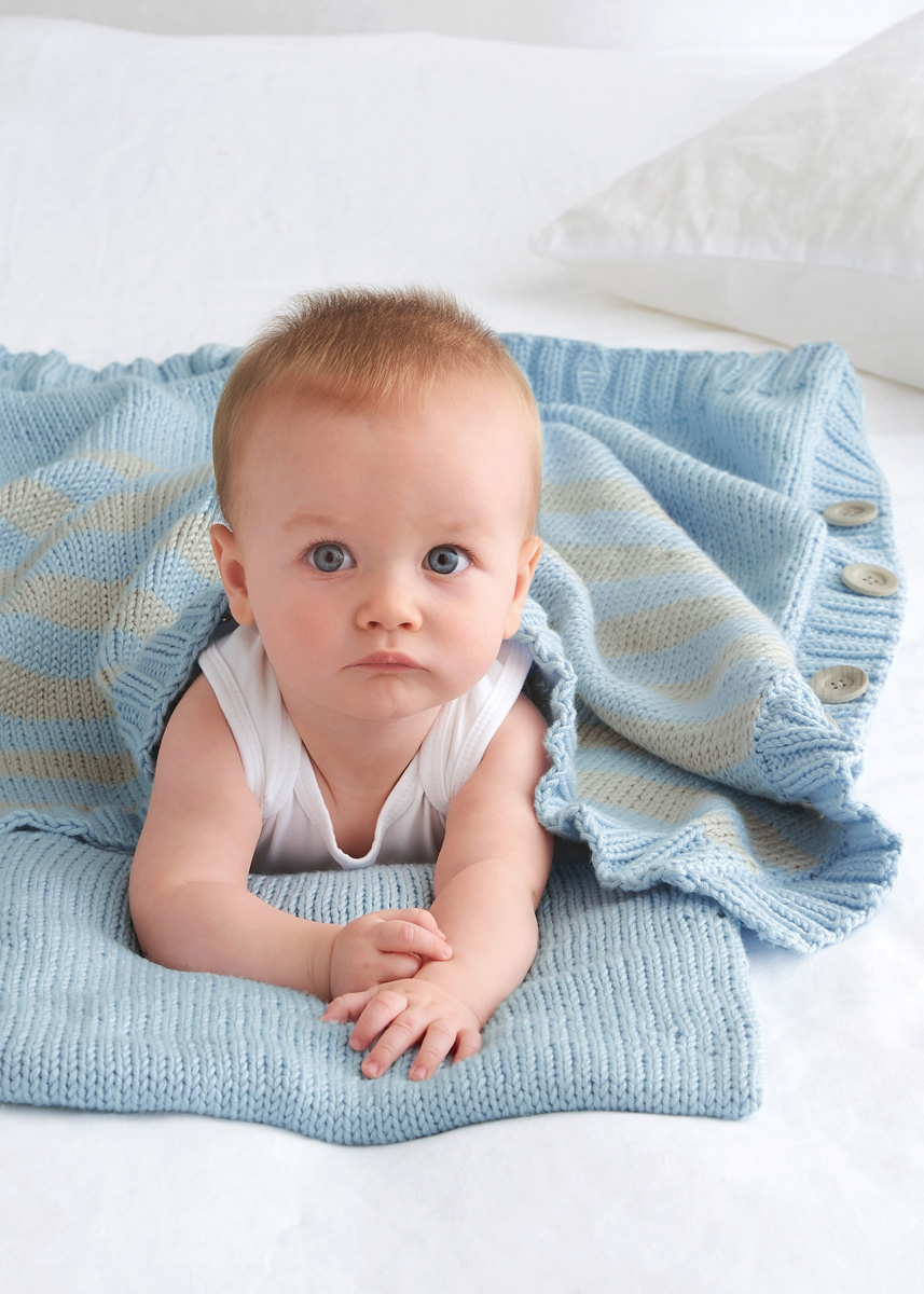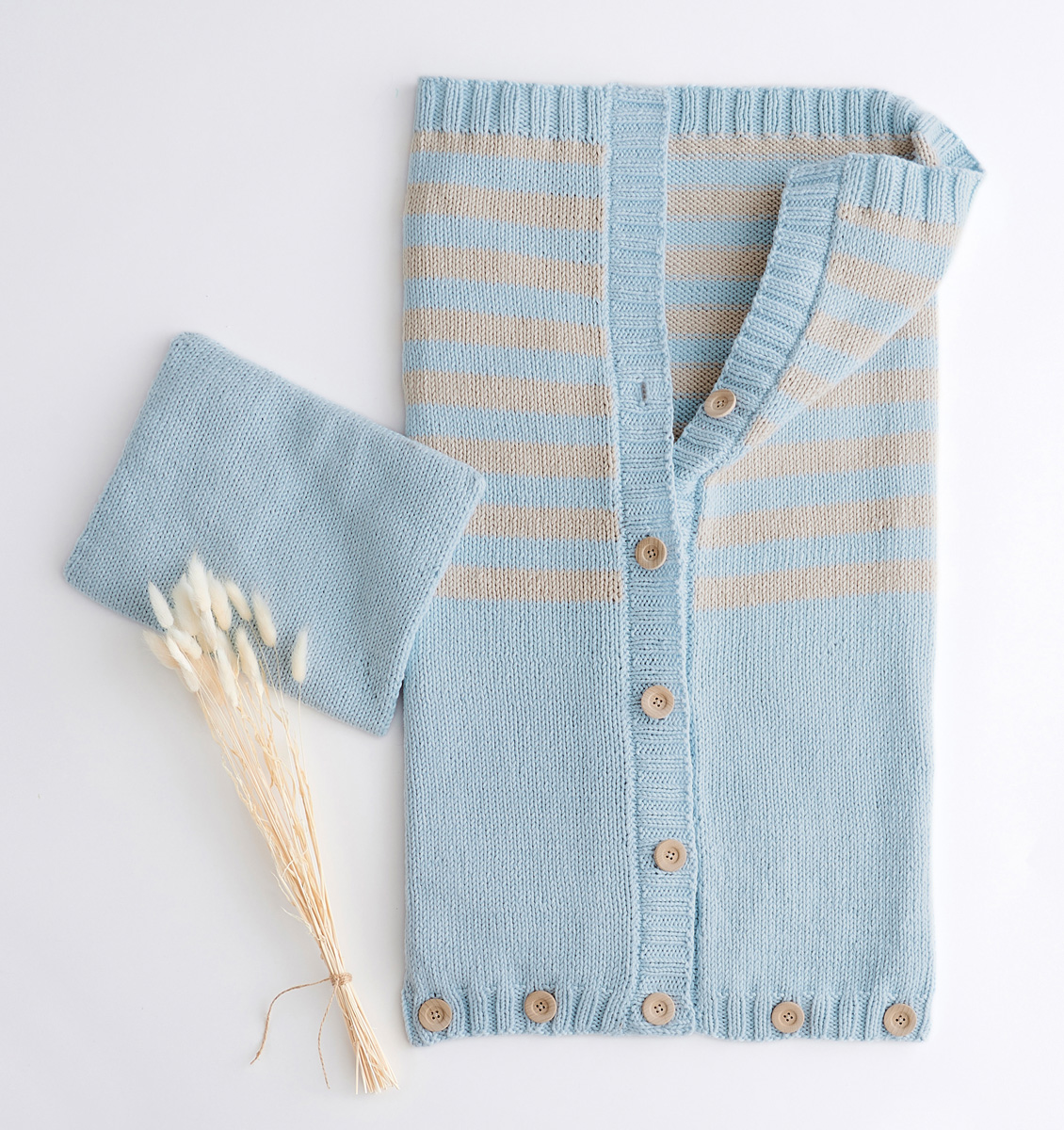 Lana Grossa Soft Cotton Big (70 % Baumwolle, 30 % Microfaser, Lauflänge 80 m/50 g) 450 g Zartblau (Fb 16) und 150 g Beige (Fb 22); Stricknadeln Nr. 4,5 und 5, je eine 40 cm lange Rundstricknadel Nr. 4,5, neun Knöpfe mit 25 mm Ø und Füllwatte.
