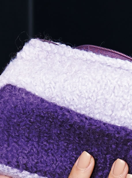 Lana Grossa Qualität „Feltro“ (100% Schurwolle, LL = 50 m/50 g), ca. 100 g Blasslila (Fb 50) und ca. 50 g Aubergine (Fb 54), Stricknadeln Nr. 8, 1 Reißverschluss in passender Farbe, ca. 16 cm lang.