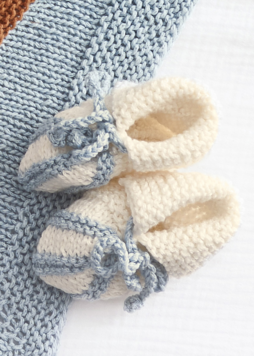 Hinweis: Der Materialverbrauch für alle 3 Teile der Kombination beträgt zusammen 250 g Eisblau und je 50 g Weiß und Zimtbraun.