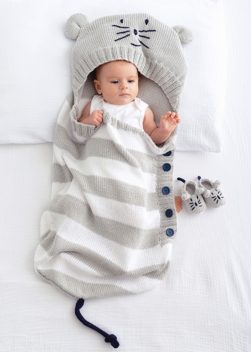 Lana Grossa Soft Cotton (70 % Baumwolle, 30 % Polyacryl, Lauflänge 140 m/50 g) 50 g Hellgrau (Fb 18), 50 g Weiß (Fb 10) und 50 g Nachtblau (Fb 17); Stricknadeln Nr. 3 und 3,5; Strickliesel; Füllwatte.