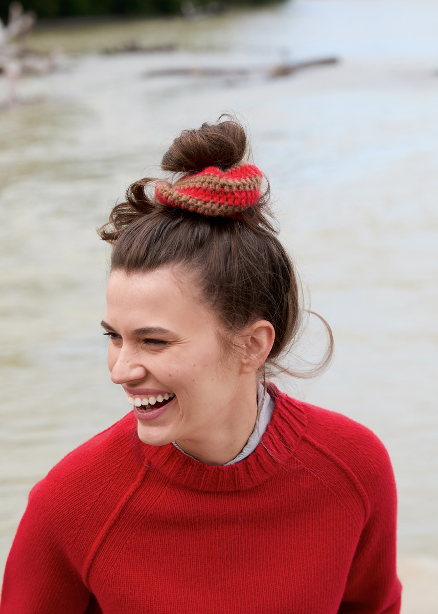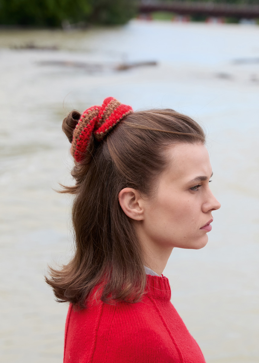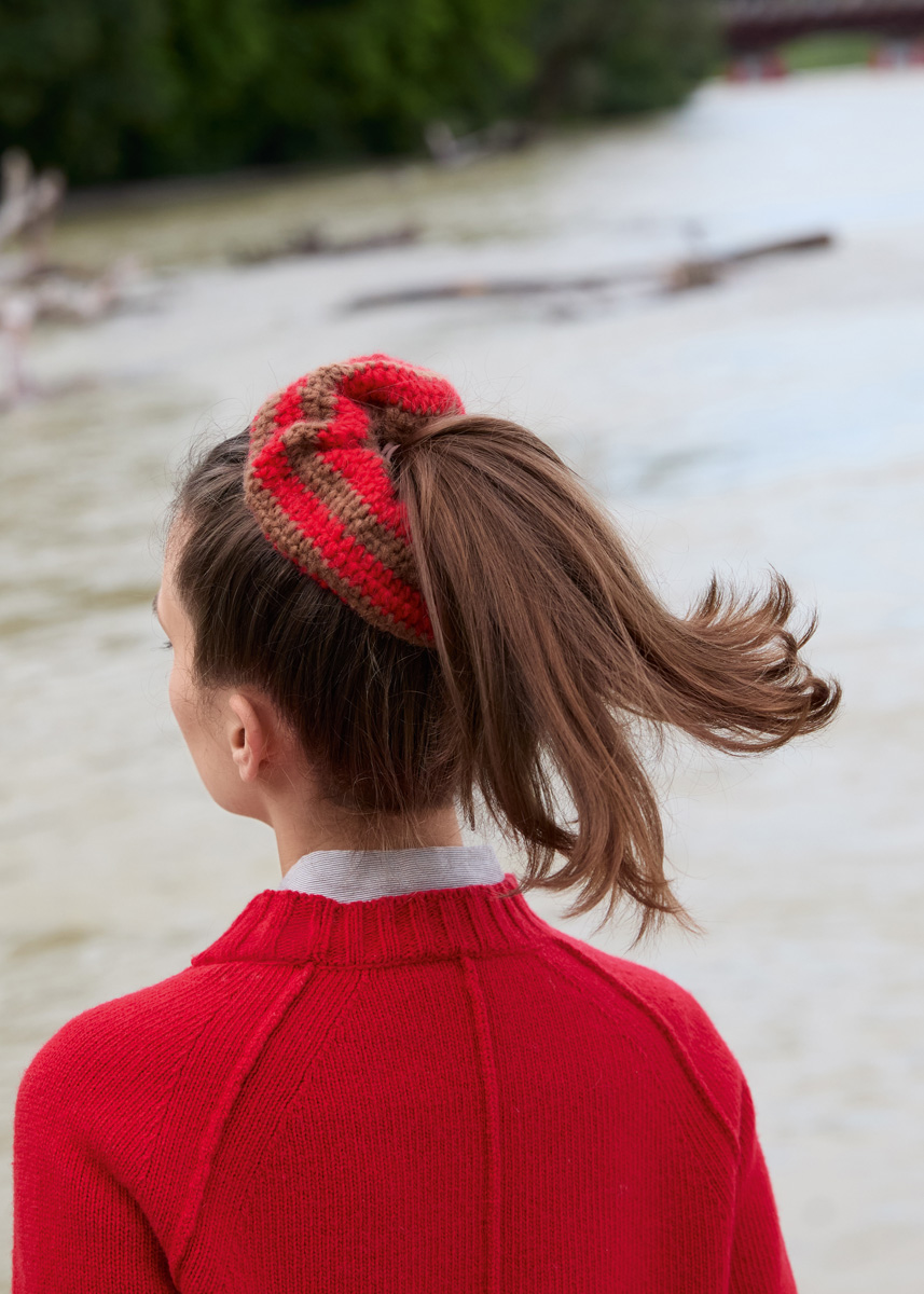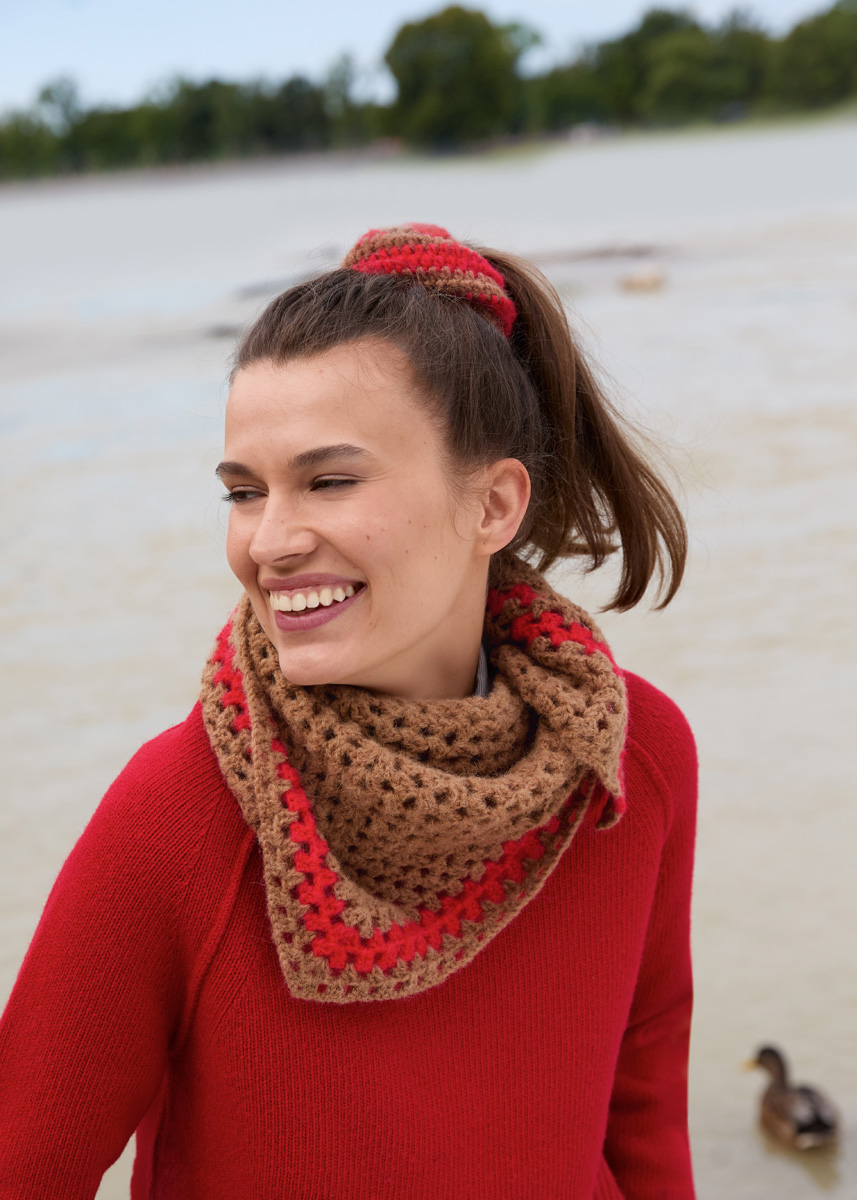 Lana Grossa „Nebbia“ (55% Schurwolle (Merino extrafine), 45% (Baby) Alpaka, LL = 170 m/50 g): je 50 g Leuchtendrot (Fb 2) und Camel (Fb 12); 1 Häkelnadel Nr 4,5, 1 Haargummi Ø 5 cm.